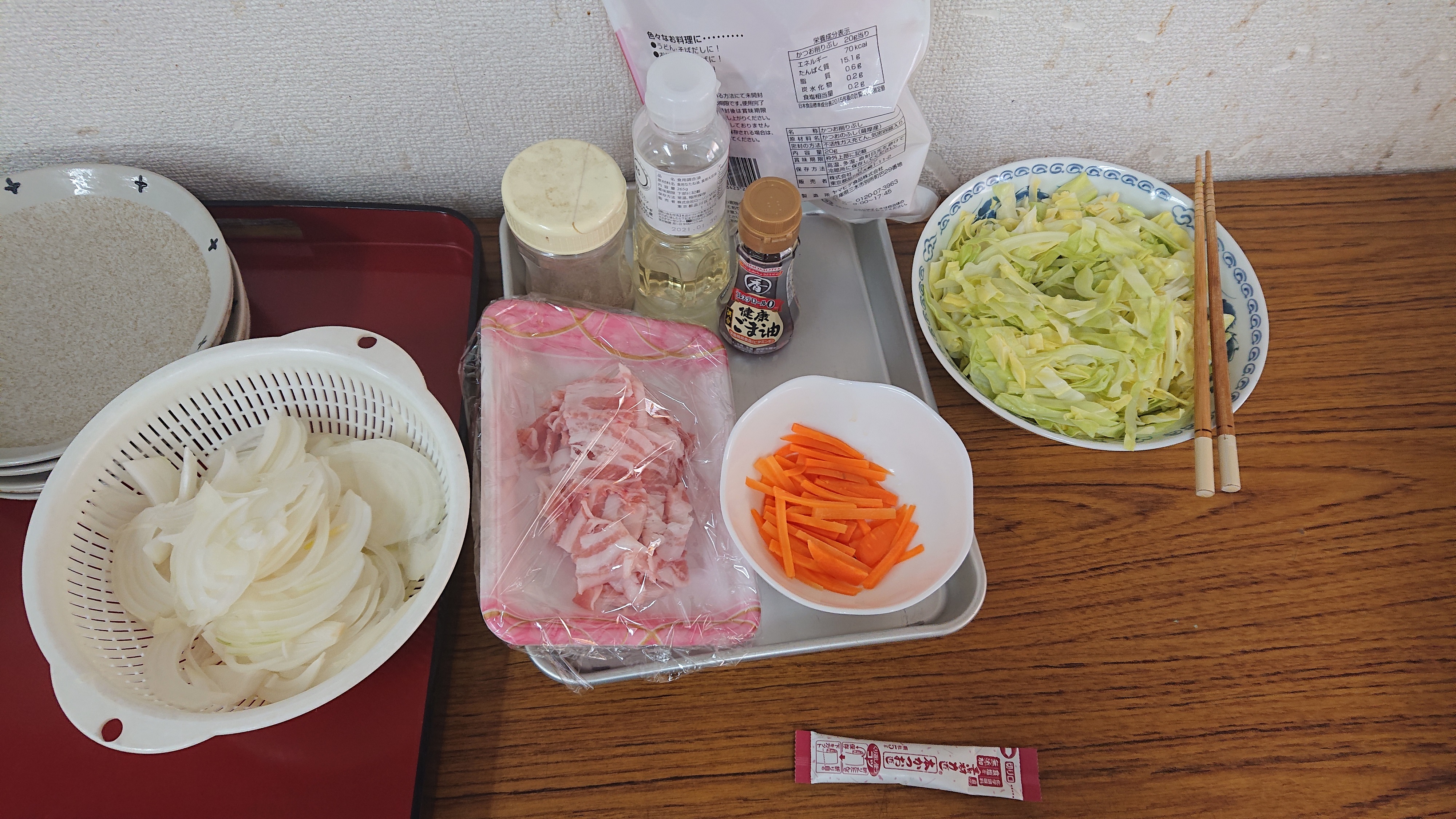 DSC_0115材料はこんな感じ。玉ねぎ人参キャベツといったシンプルな具で、だしとしょうゆベースの味付けです。