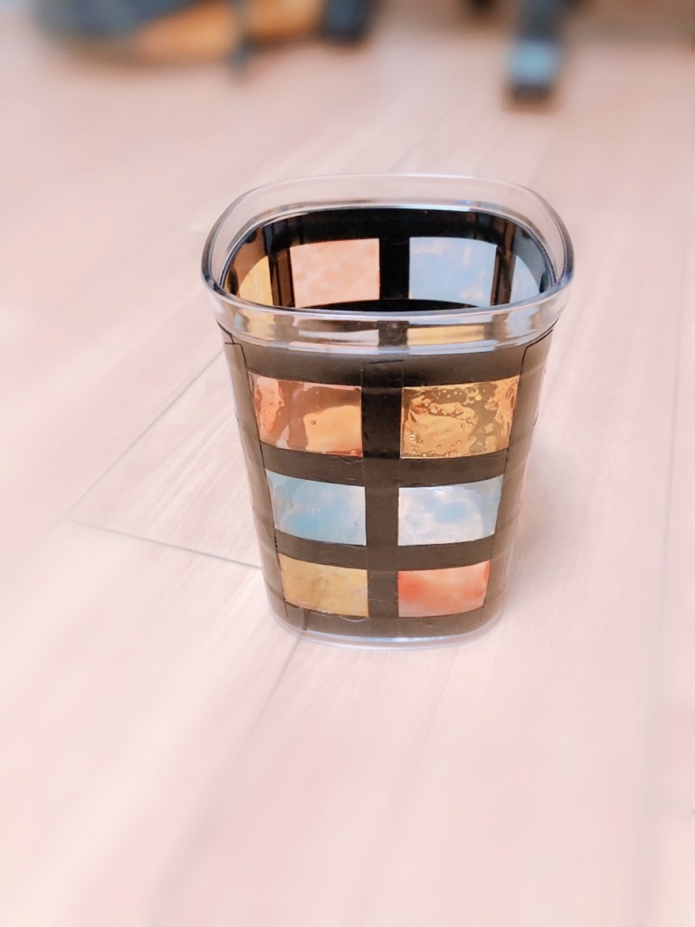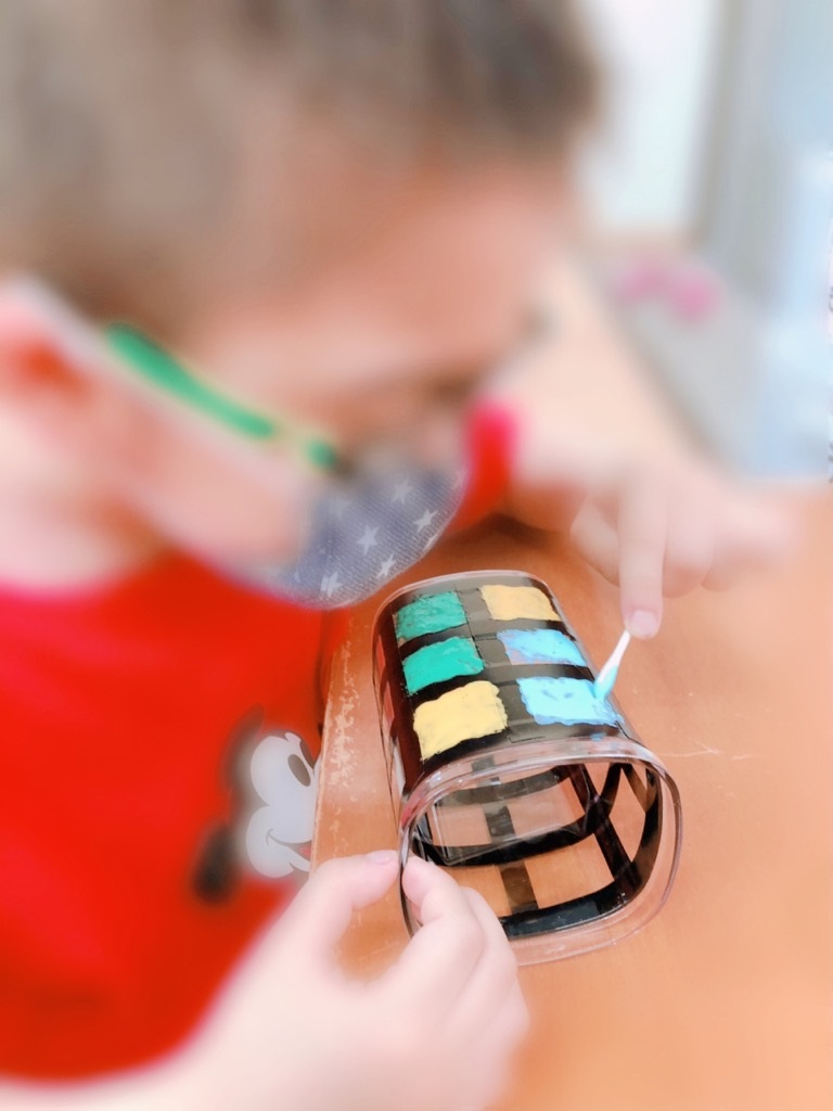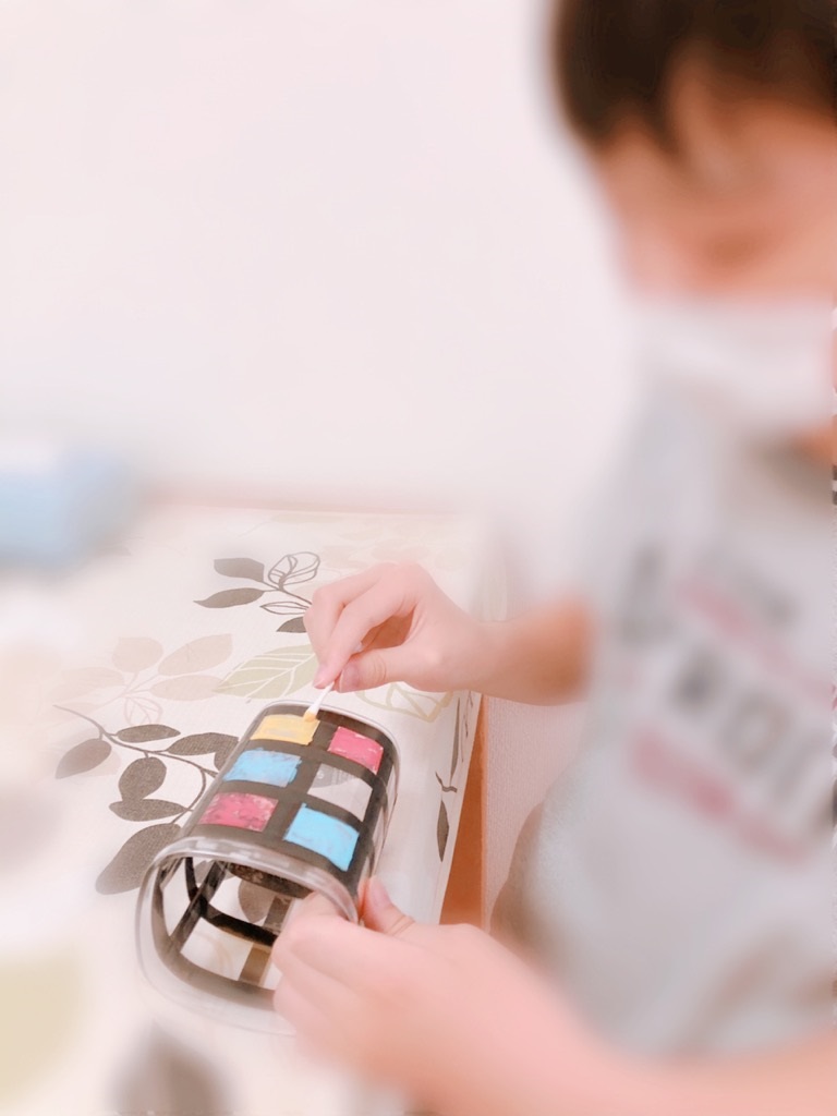 ガラス絵の具を塗って、ステンドグラス風のペン立てを作りました!