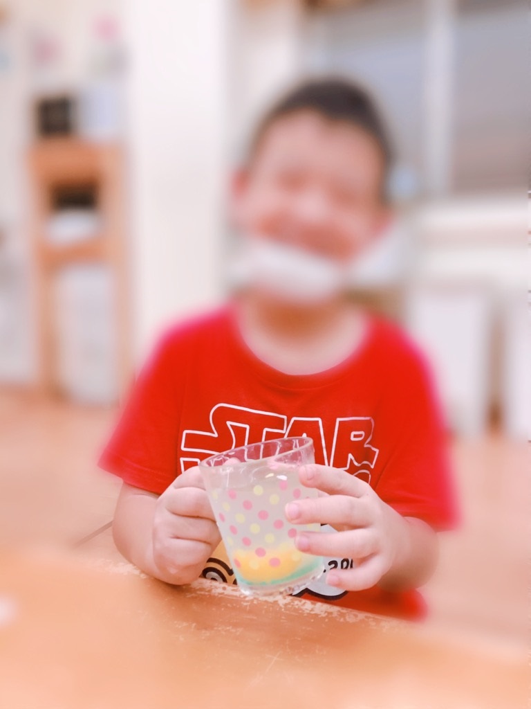 ジュースの中に入れます!すると…シロップがコップの底に沈みます!