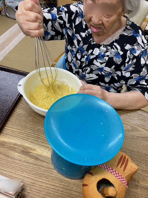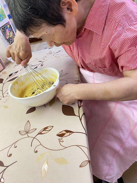 ホーム > 未分類 > 今月のお菓子作り 2020/08/18 外に出たい!!でもコロナに加えて暑さのせいで出られない! 職員もフラストレーションが溜まってしまう今日この頃。こんな時は冷たくて甘いお菓子を作って食べるのが一番!!!!! 早速生地の作成を頼むと集中して行ってくださいました。 ・・・できましたか? 具合はばっちりですね! 中には🍫と 🍌が入ります 職員のこだわりダルゴナコーヒーと一緒に美味しくいただきました! 浜松で41.1度という暑さをたたき出したこの夏ですが、なんとか室内で楽しめることを続けていきたいですね! - 未分類