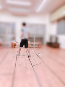 床に貼られたビニールテープを目印に線をたどっていくと…