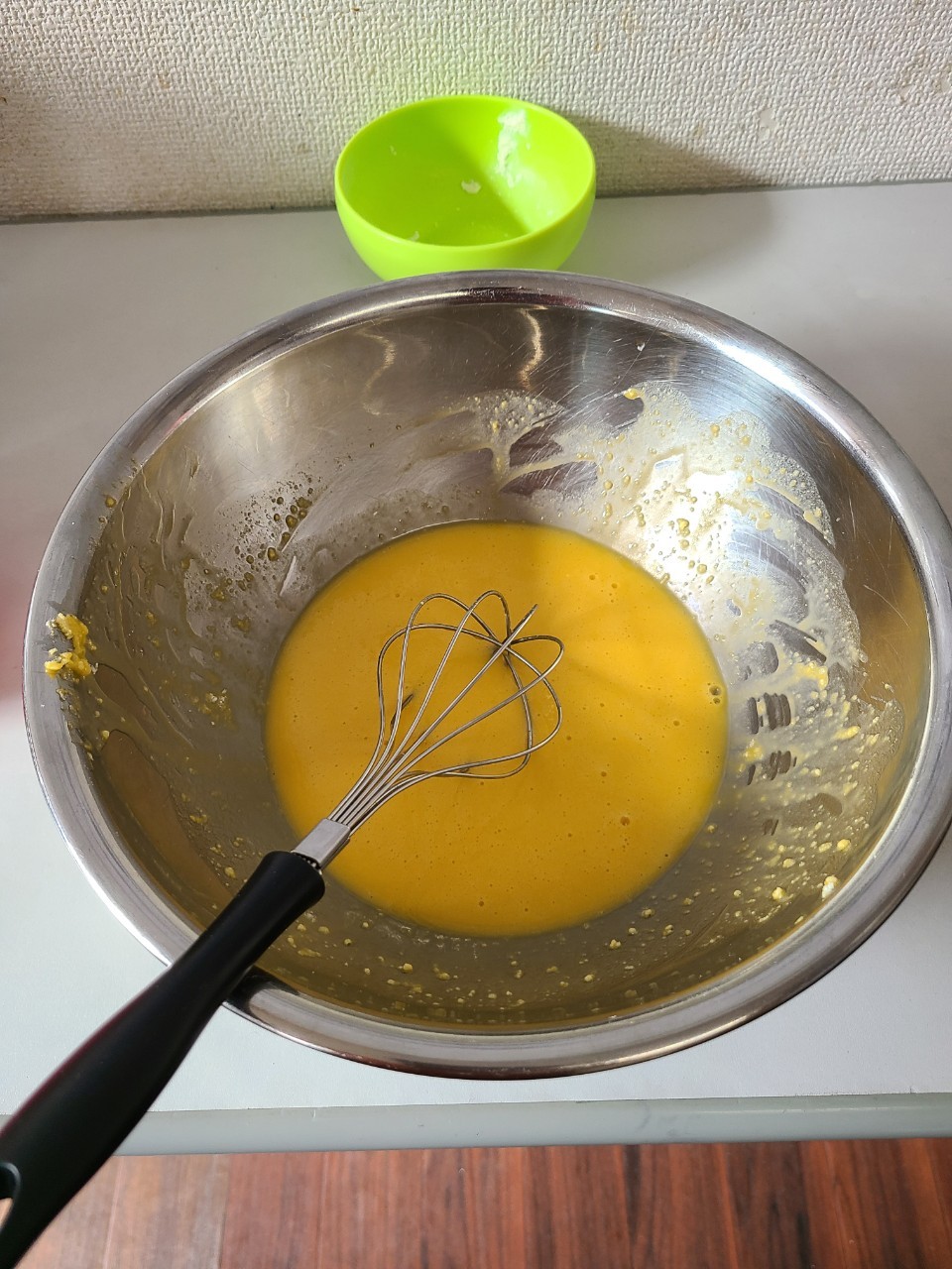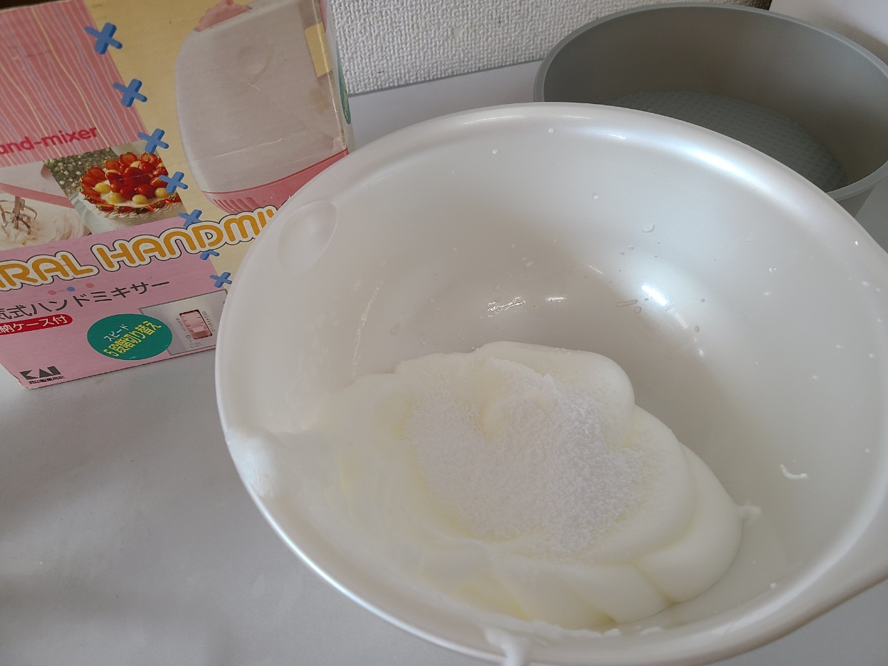 卵白と卵黄を分けグラニュー糖を入れ泡立て、卵白はメレンゲを作ります。