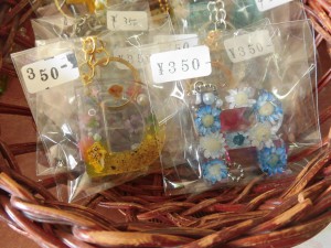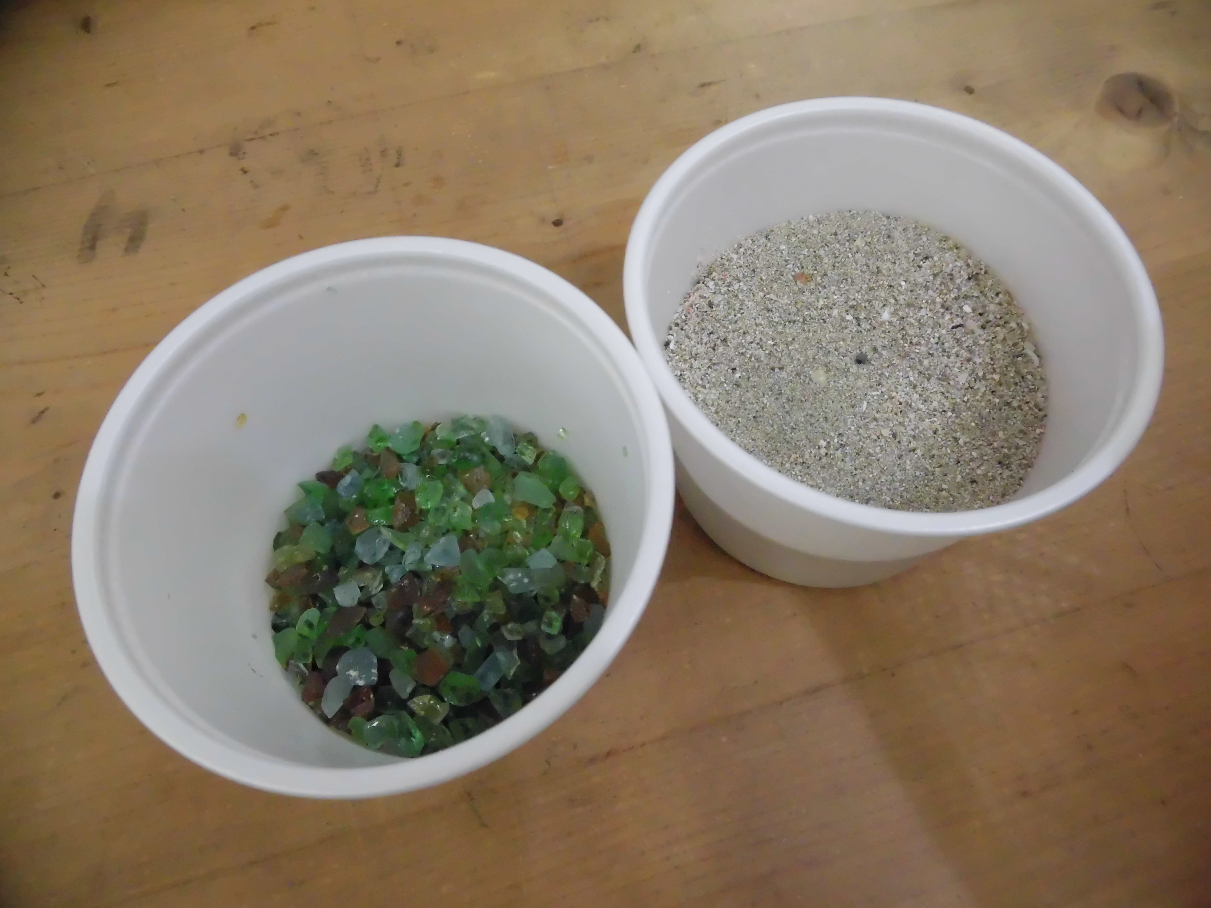 近くの砂浜に拾いに行ったシーグラス、貝殻、砂を使って