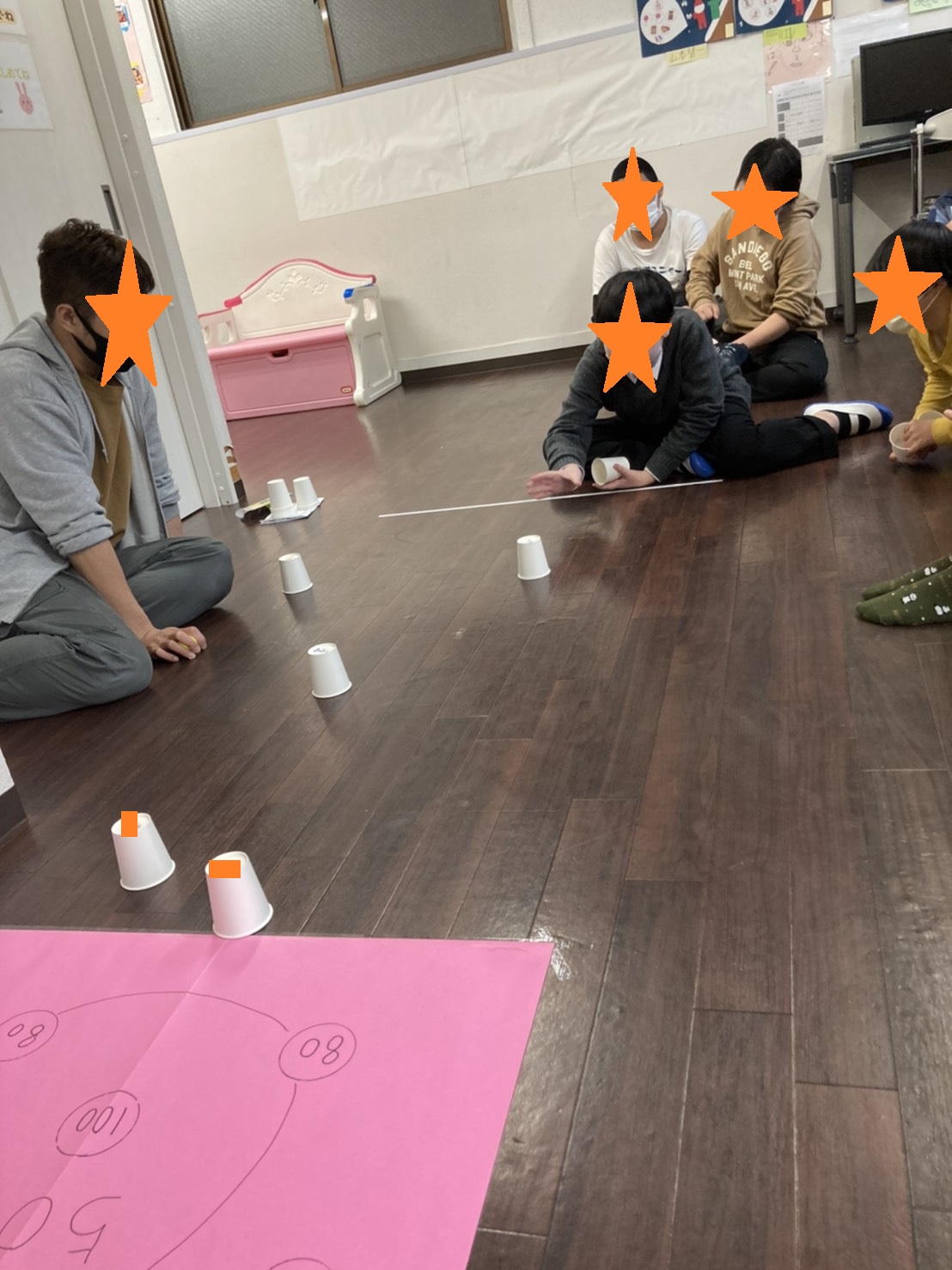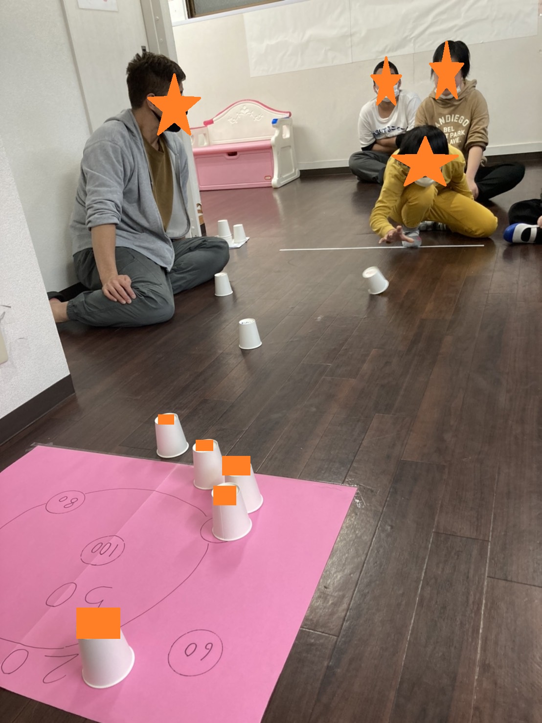 勢いが強すぎてボールが紙コップから出てしまったり、得点ゾーンからはみ出てしまったりと以外に調整が難しいこのレクリエーション。