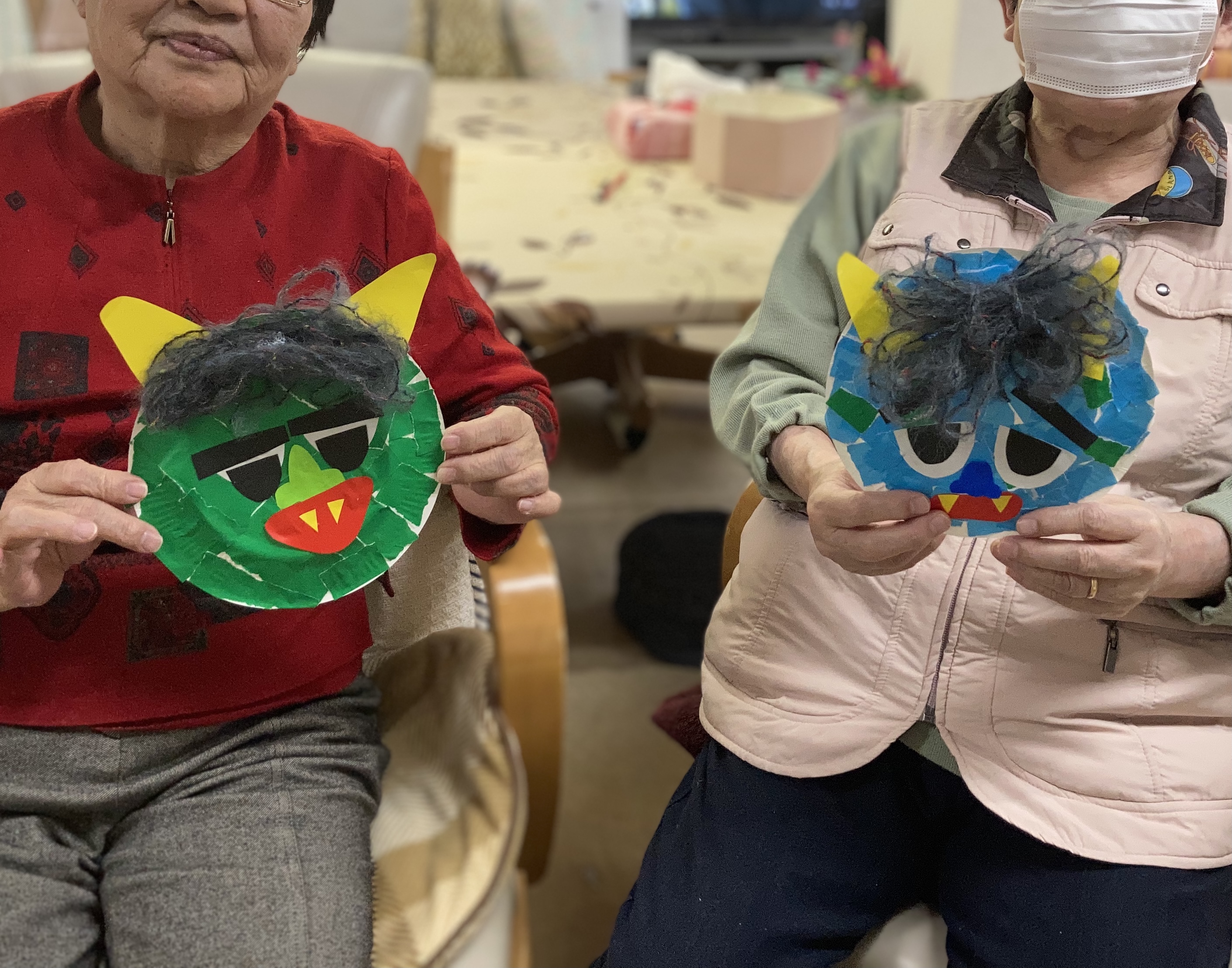 紙皿を使い、鬼を作ってみました(^^)