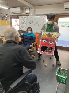 ホーム > 未分類 > 節分当日 2021/02/15 2021/02/16 デイ・夢愛の節分は、昼食に恵方巻をちょこっと召し上がって頂き、 レクで手作りの鬼の的を作り、お手玉を投げて「鬼は~外!福は~内!」と言いながら、鬼の口を狙ってもらいました。 皆さんとても上手に穴に入れていたので、的動かしたりしてハードルを上げてみたり…。 皆さんに福が訪れますように。 - 未分類