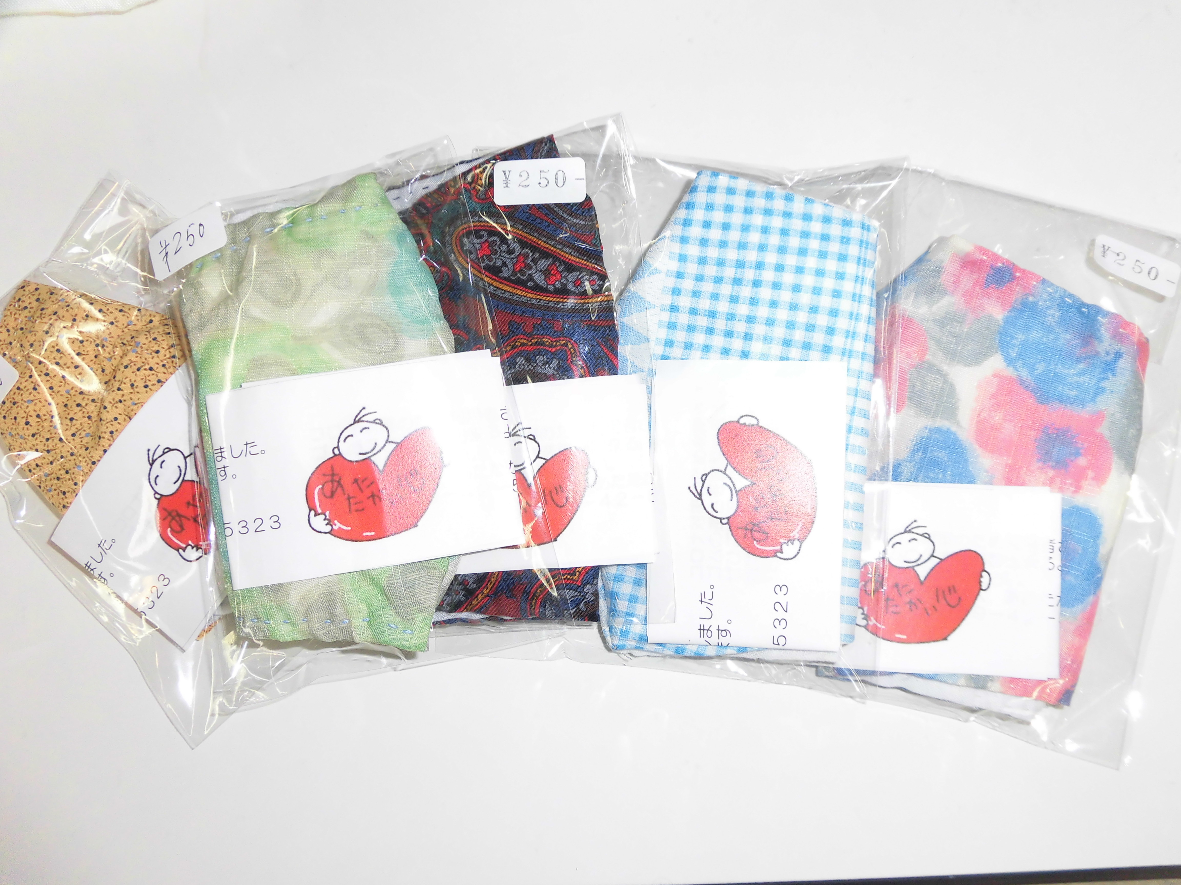 利用者さんが手縫いで縫ったこちらのマスクをつけることにより顔周りもおしゃれになり第一印象も良くなるでしょう✨CIMG3636このマスクは大人用だけでなく子供用もあり250円で販売しております。