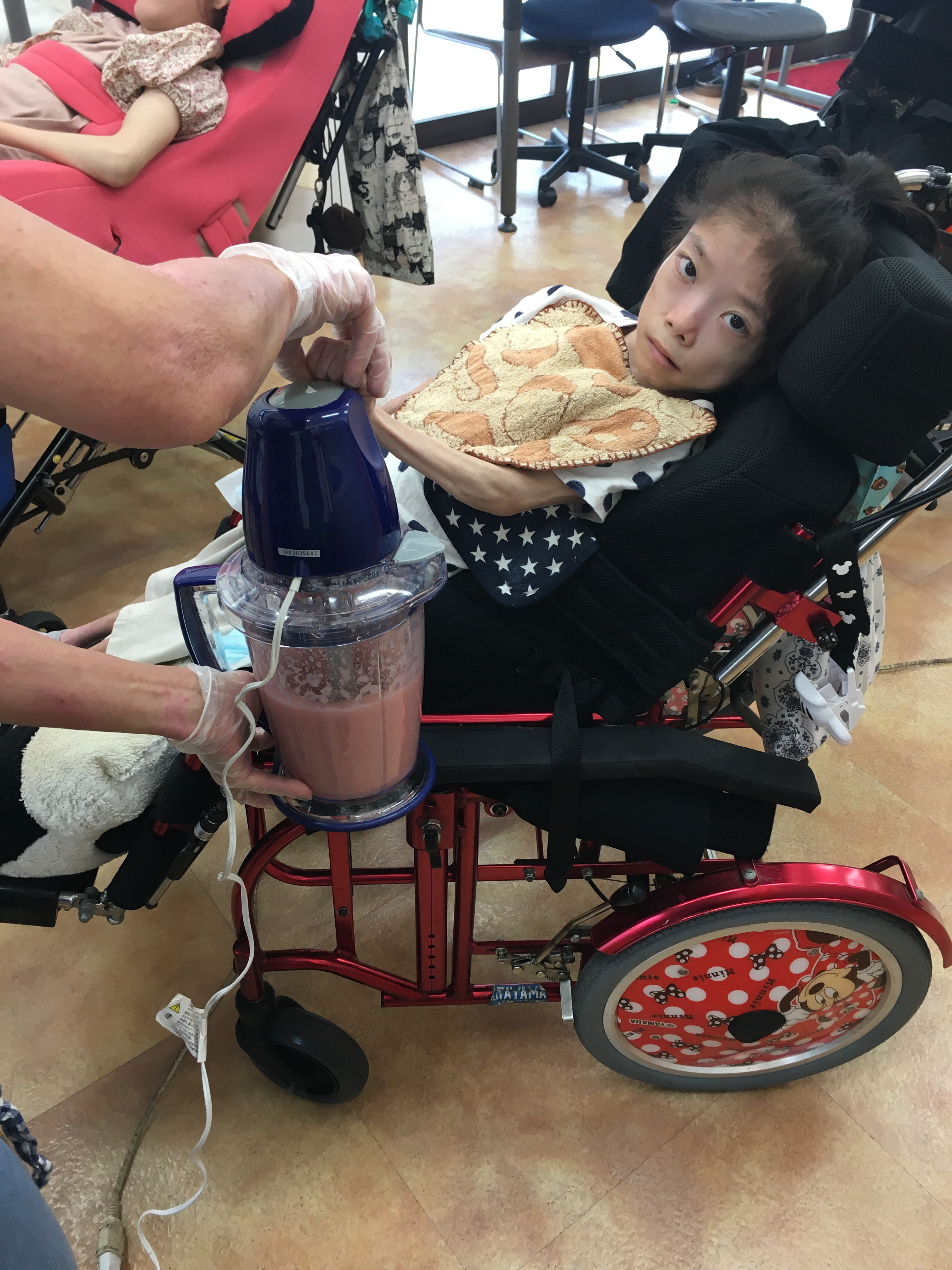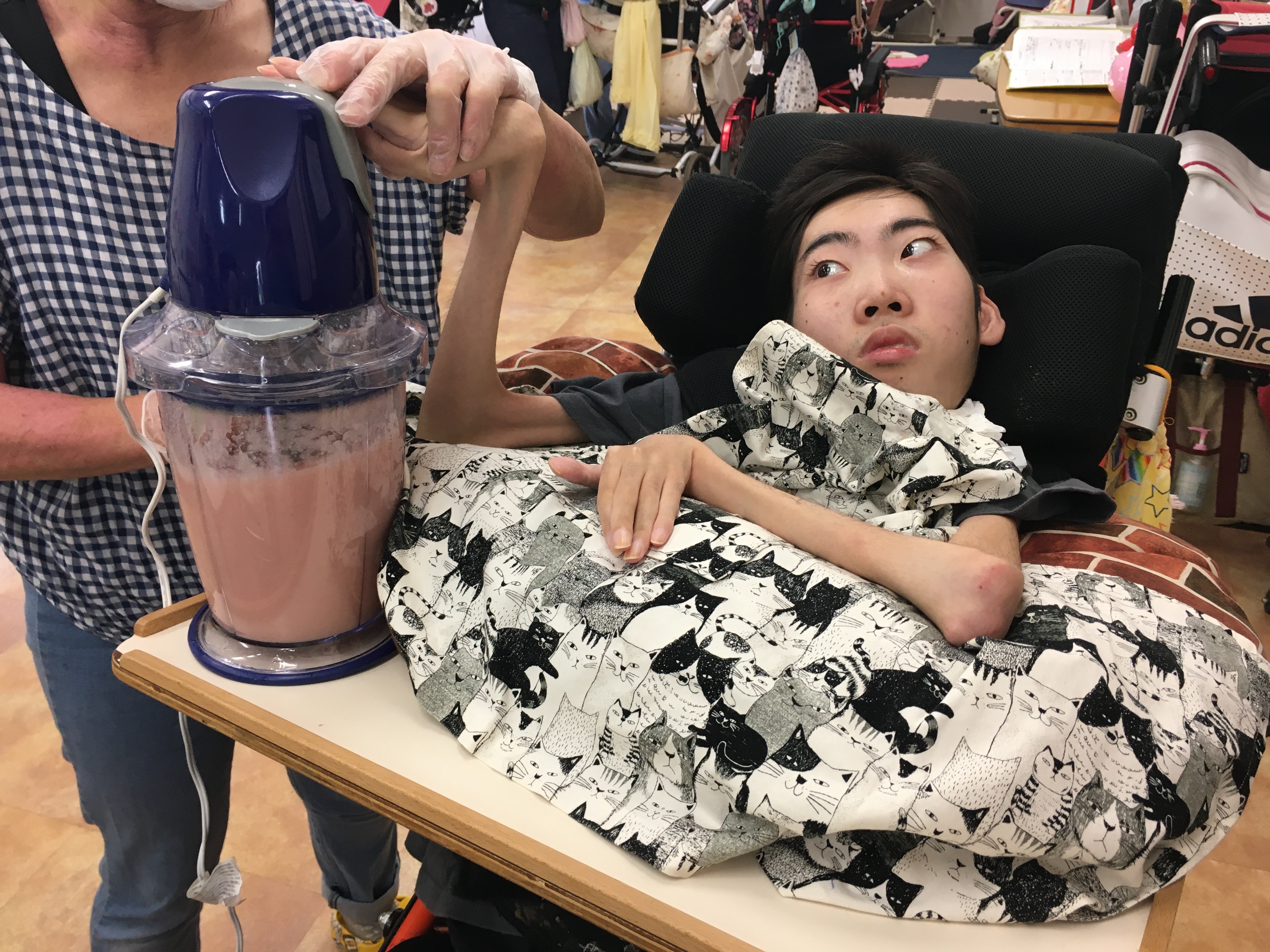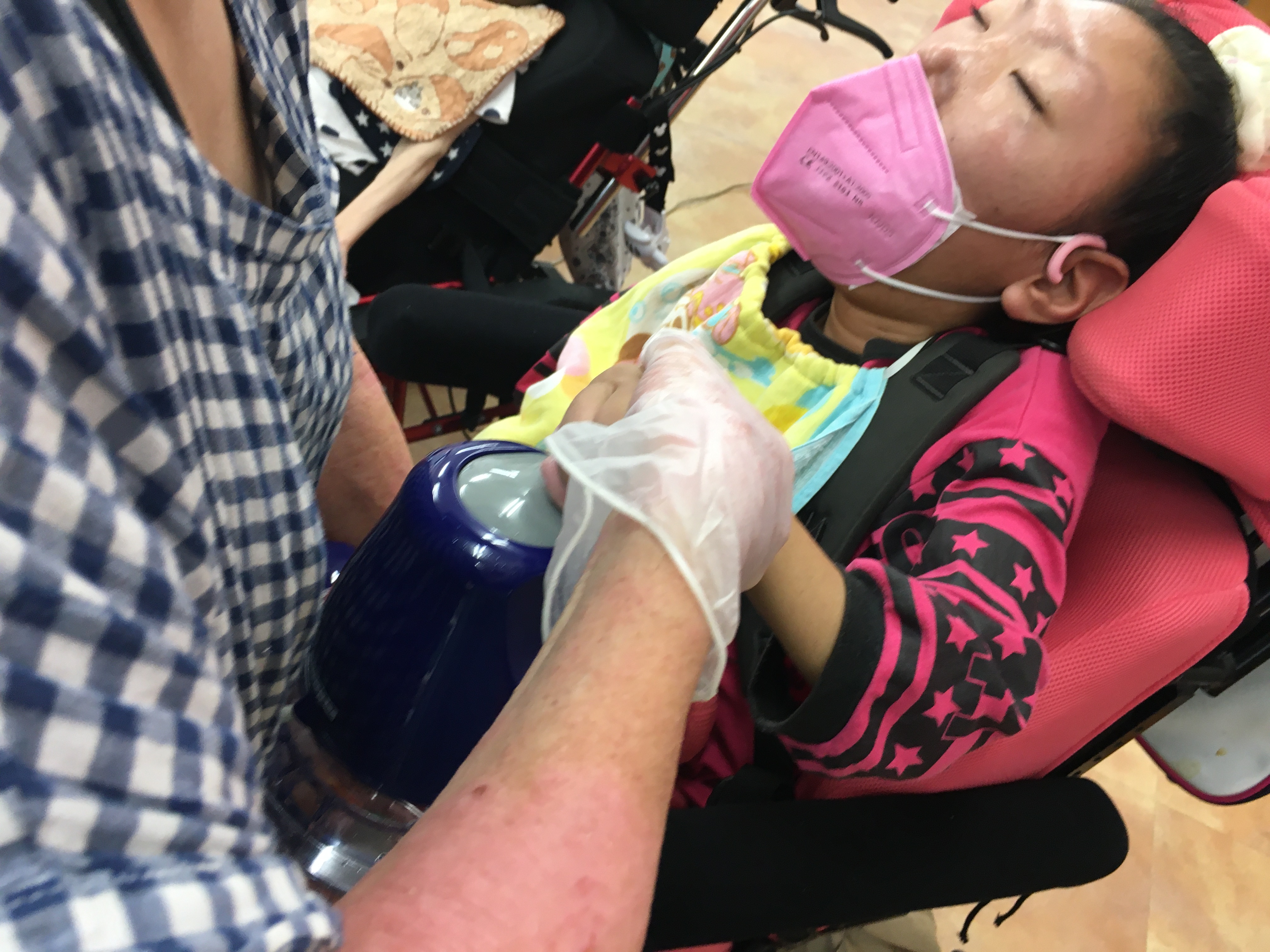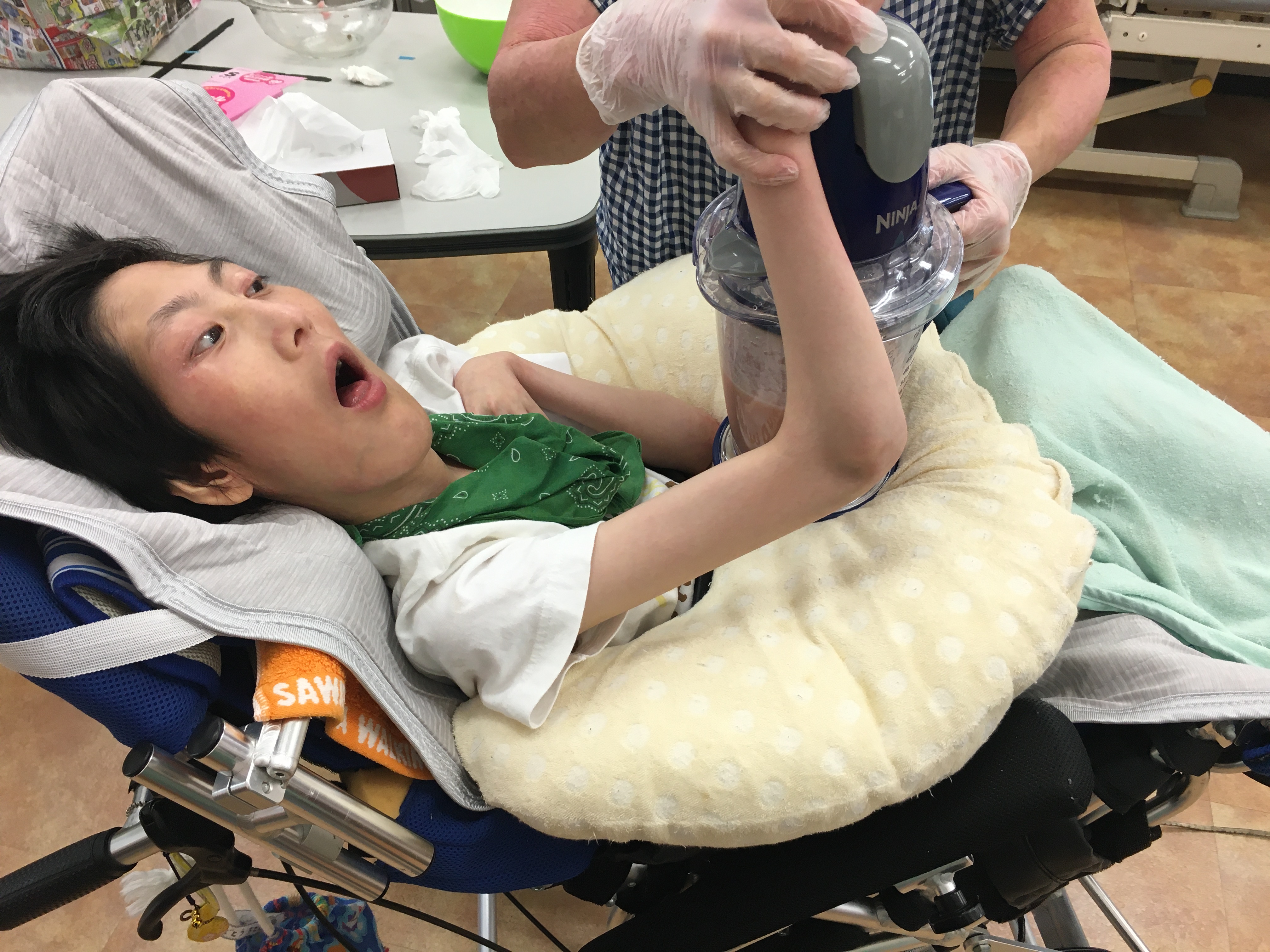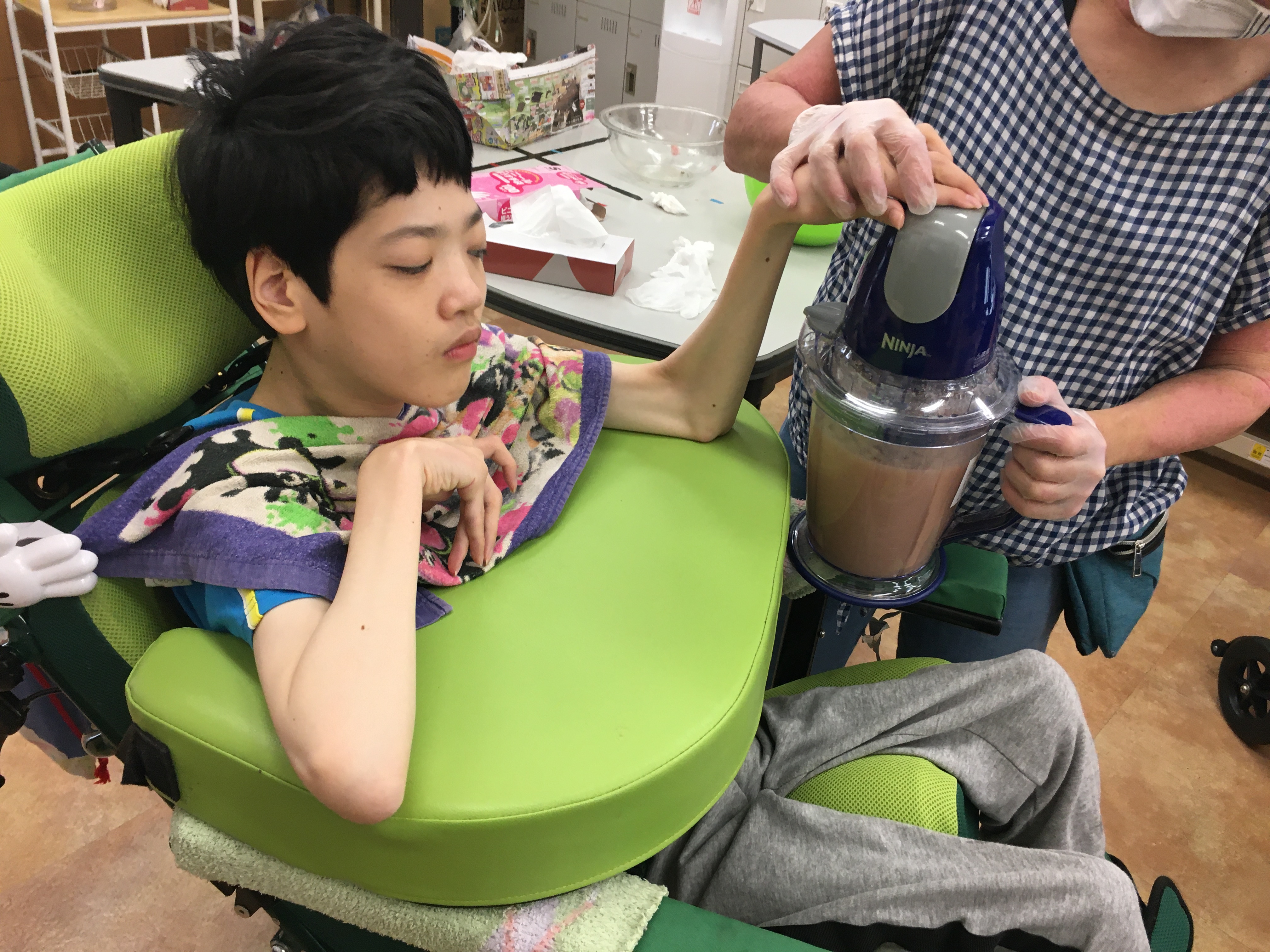 ミキサーの振動にビクッとびっくりする子や笑顔になる子、