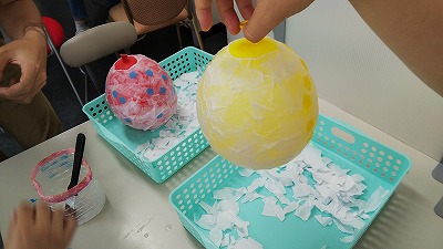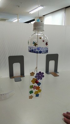 日中活動で余暇の時間を利用してランプシェード(らしきもの)や、風鈴(に似た何か)を作って過ごしました。