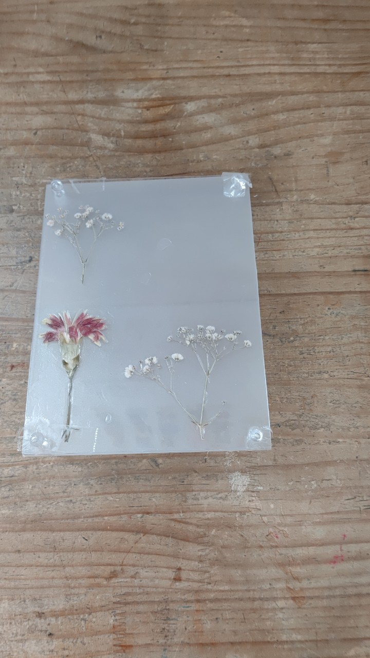 押し花は、2枚のコルク製の鍋敷きの間に、キッチンペーパーとティッシュペーパーに花を挟み、