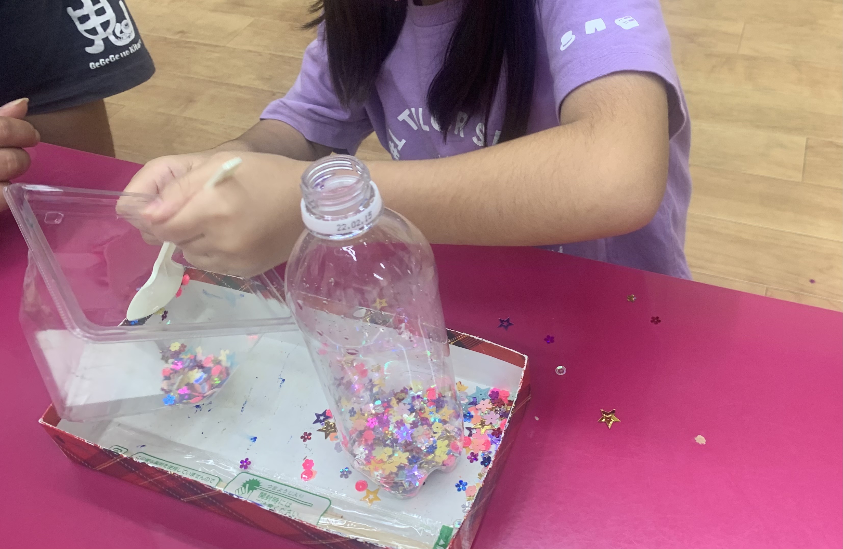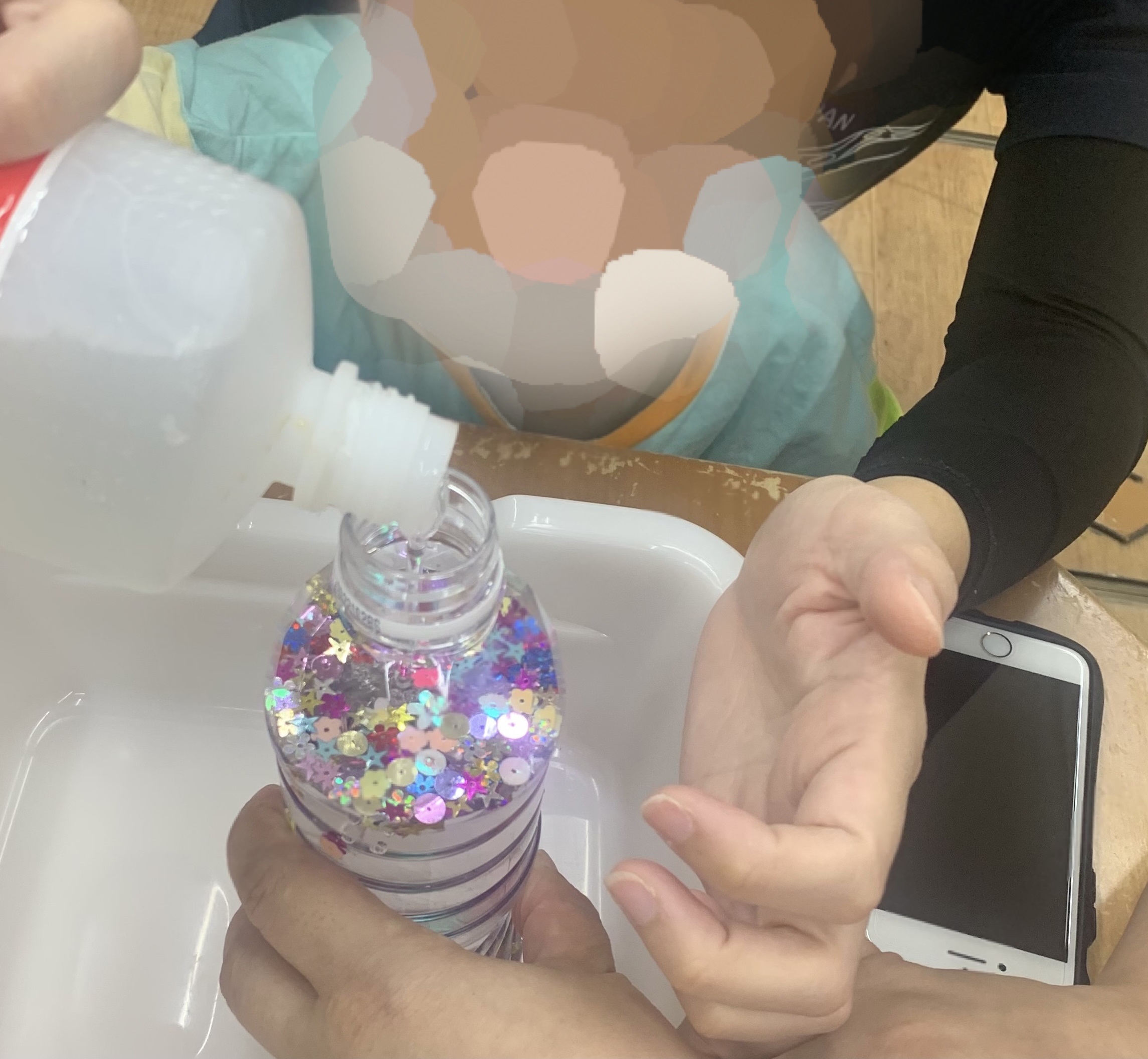 子どもたちは張り切って、「やりたい!」と言ってたくさんスパンコールをペットボトルに入れていきます♪