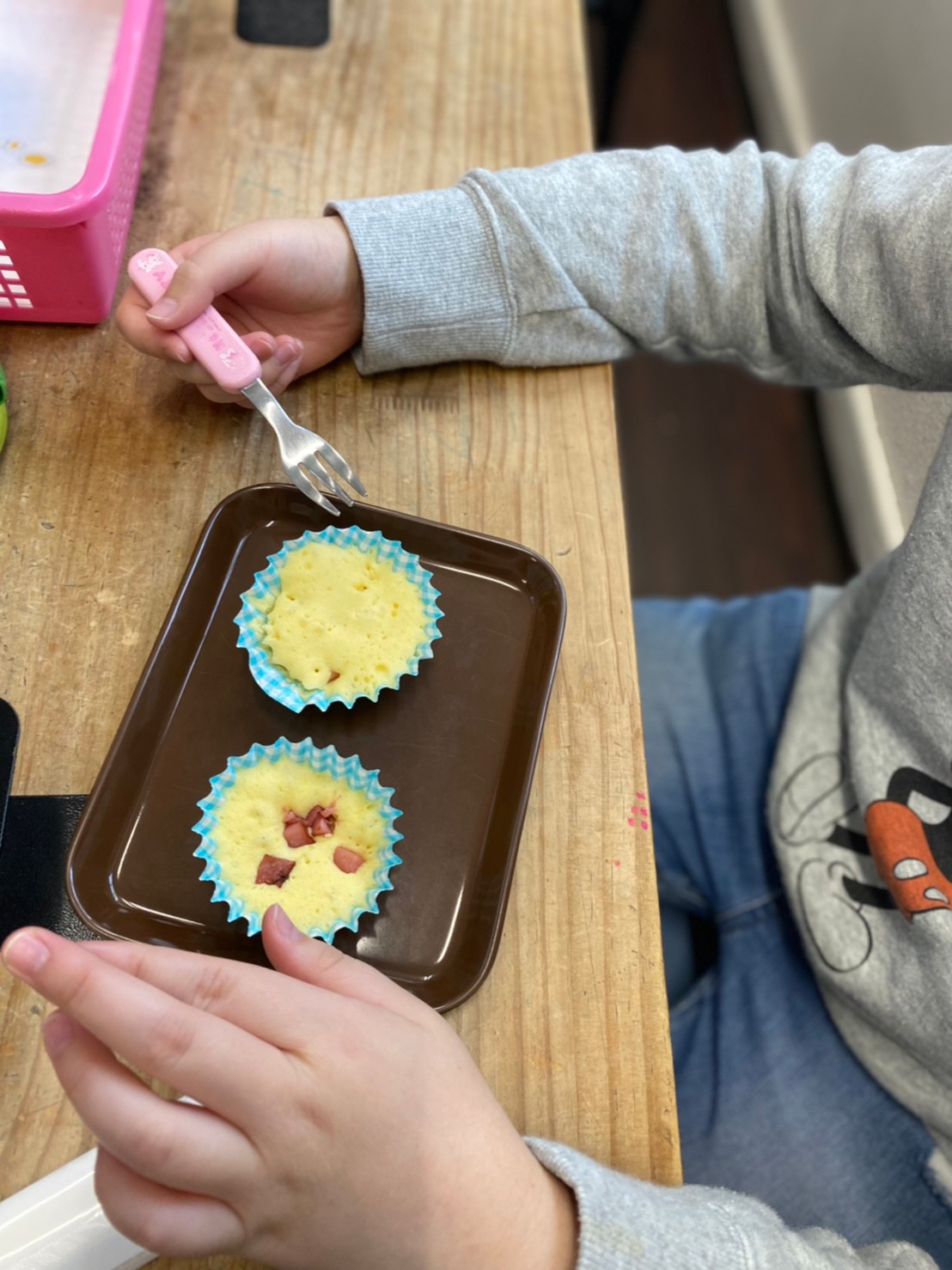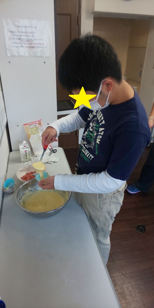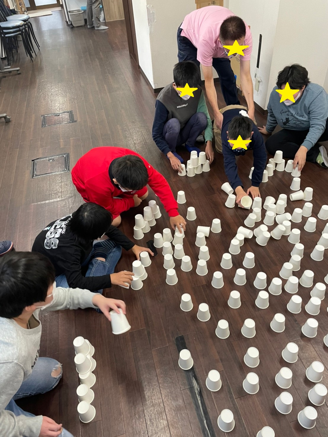 今回は、おやつ作り(ベーコン蒸しパン)と室内レク(紙コップタワー)をやりました。
