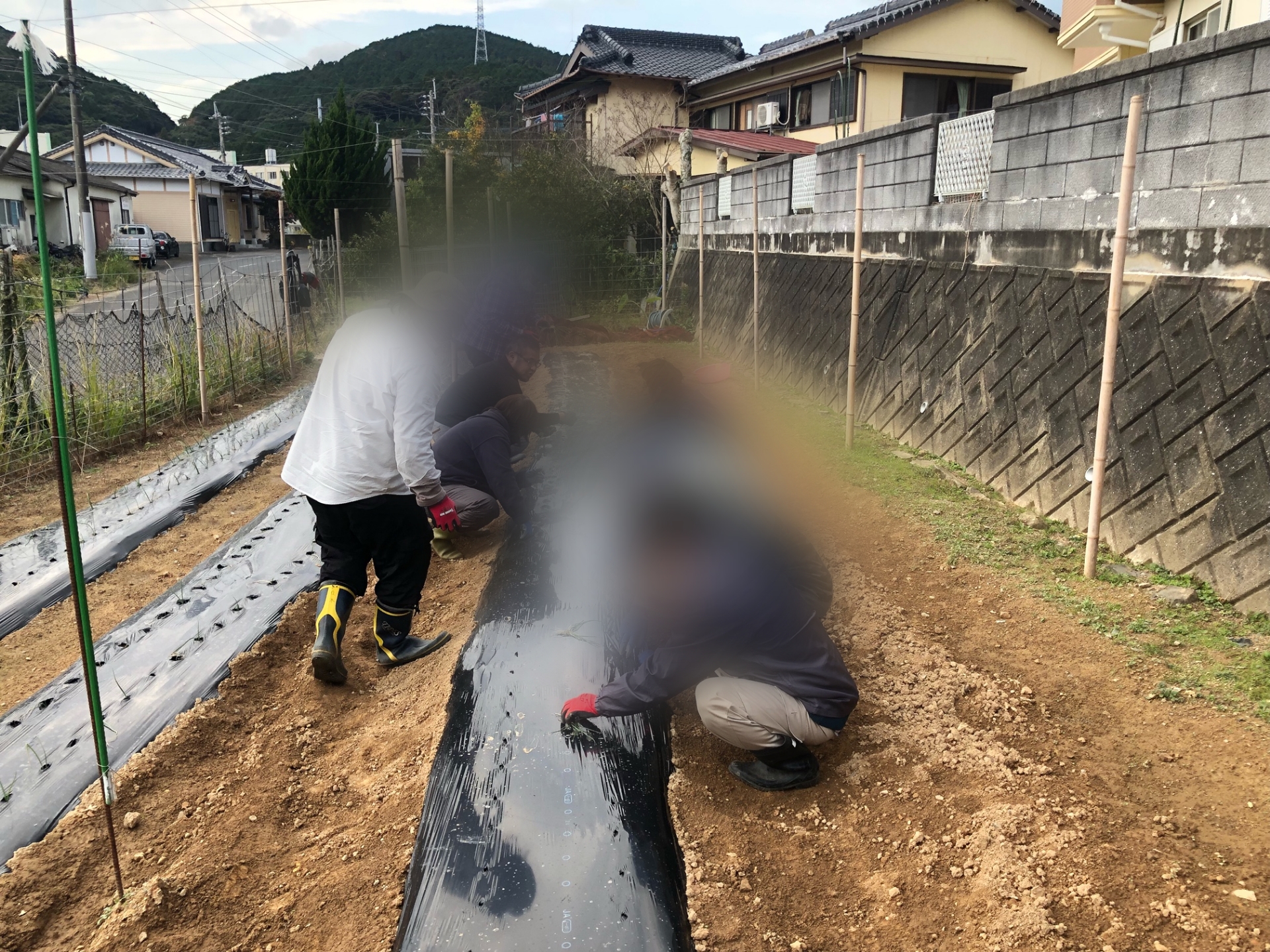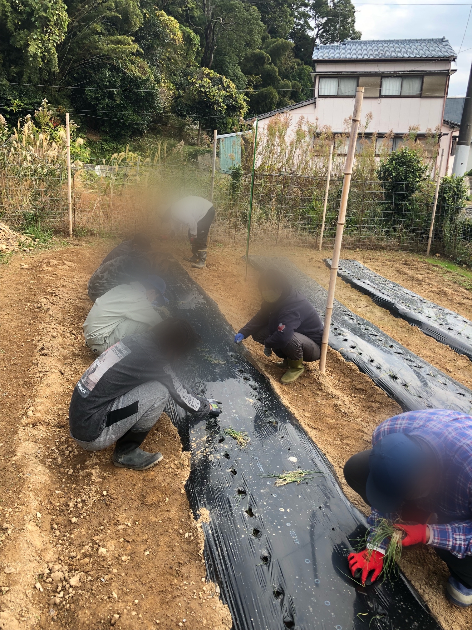 マルチ(黒いビニールシート)に15cm間隔で穴を開けて一本一本丁寧に植えます。