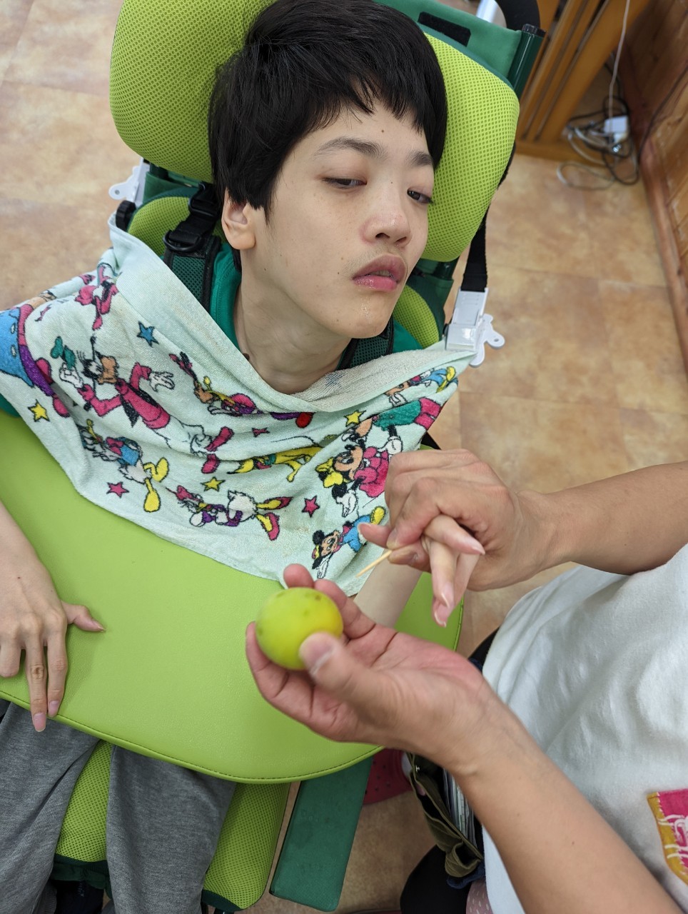 食べると酸っぱいよーと言いながら全部の実に穴をあけていきました♪