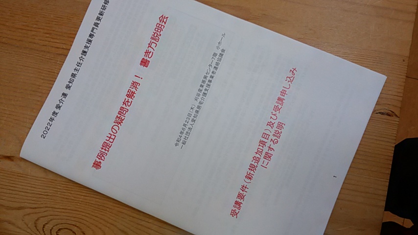 ホーム > 居宅介護支援事業所 > 「主任介護支援専門員(主任ケアマネ)更新研修」の課題の書き方説明会に行ってきました。 2022/07/18 言うなれば、「研修で使う課題の作り方」を出来の悪い受講生の為に、事前に教えて差し上げましょうという親切な催しです。 こちらの出来が悪すぎて理解が進まず、あえなくやる気を失ってしまいました。 自分とは、刈谷市より小牧市の方が相性が良い気がする…。(次回開催地:小牧市) - 居宅介護支援事業所