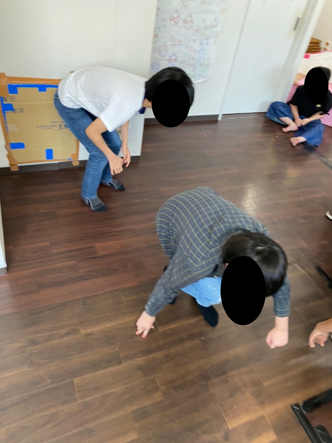 トムソーヤでは今回「石ゲーム」というものを行いました。音楽に合わせて室内を歩きタンバリンの音を聞き分けて止まったり、しゃがんだりと色々な動きをしてもらいました。
