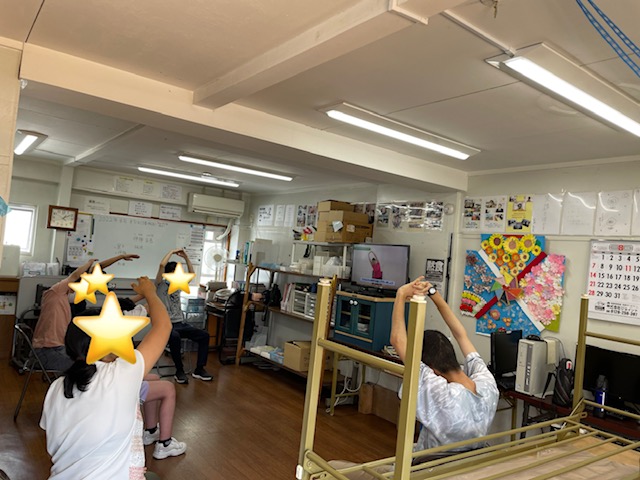 ↓体力づくりの時間では本当はそとに出てウォーキングに出かけたいのですが、あまりの暑さで外は危険なので、涼しい室内で座ってストレッチ体操を行っています。一つ一つの動きがゆっくりなんで以外に疲れます。。。