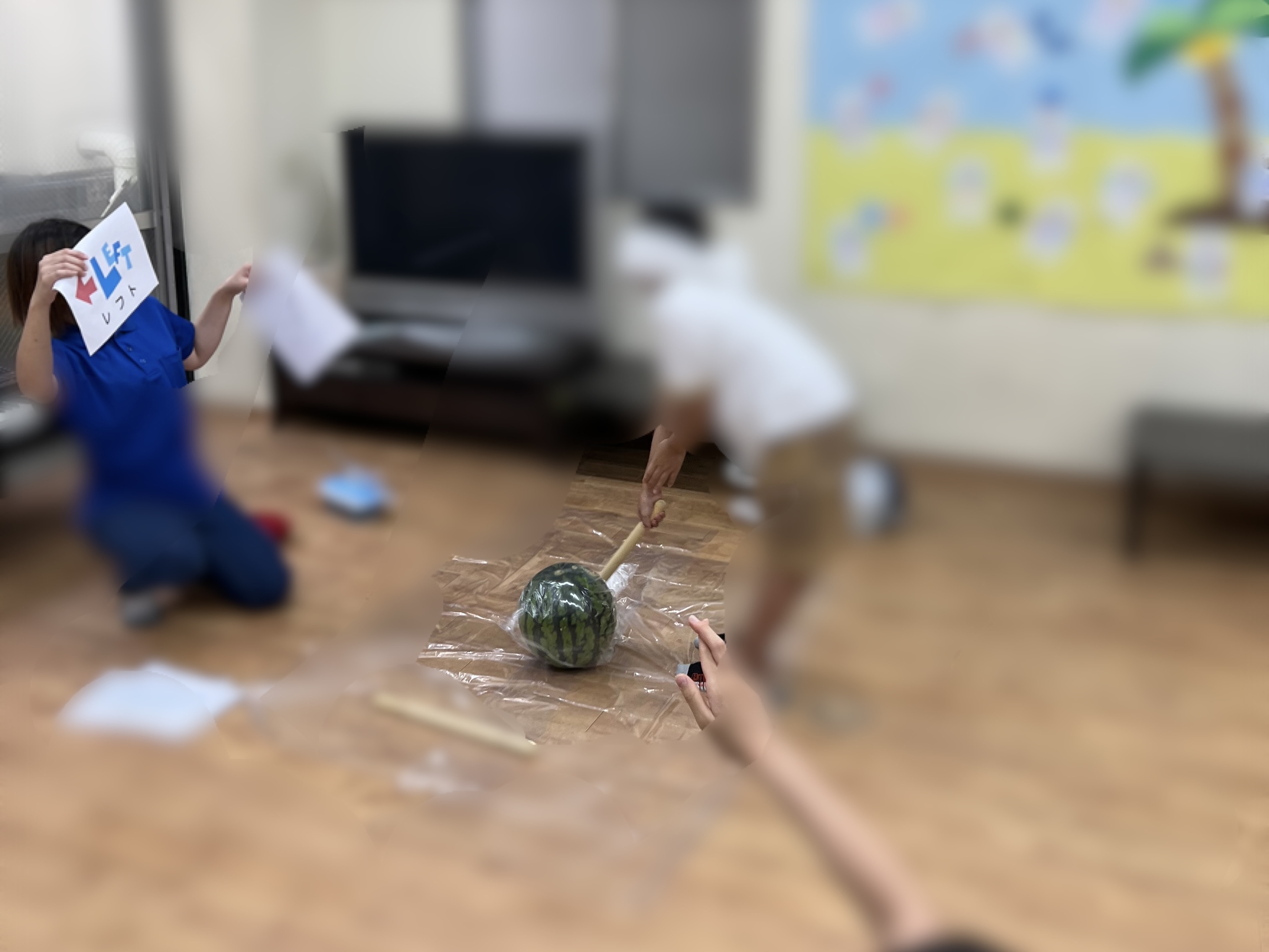 今月は、夏ということでスイカ割りをしながら英語を学びました!(※感染症対策の為スイカを袋に入れて行いました)