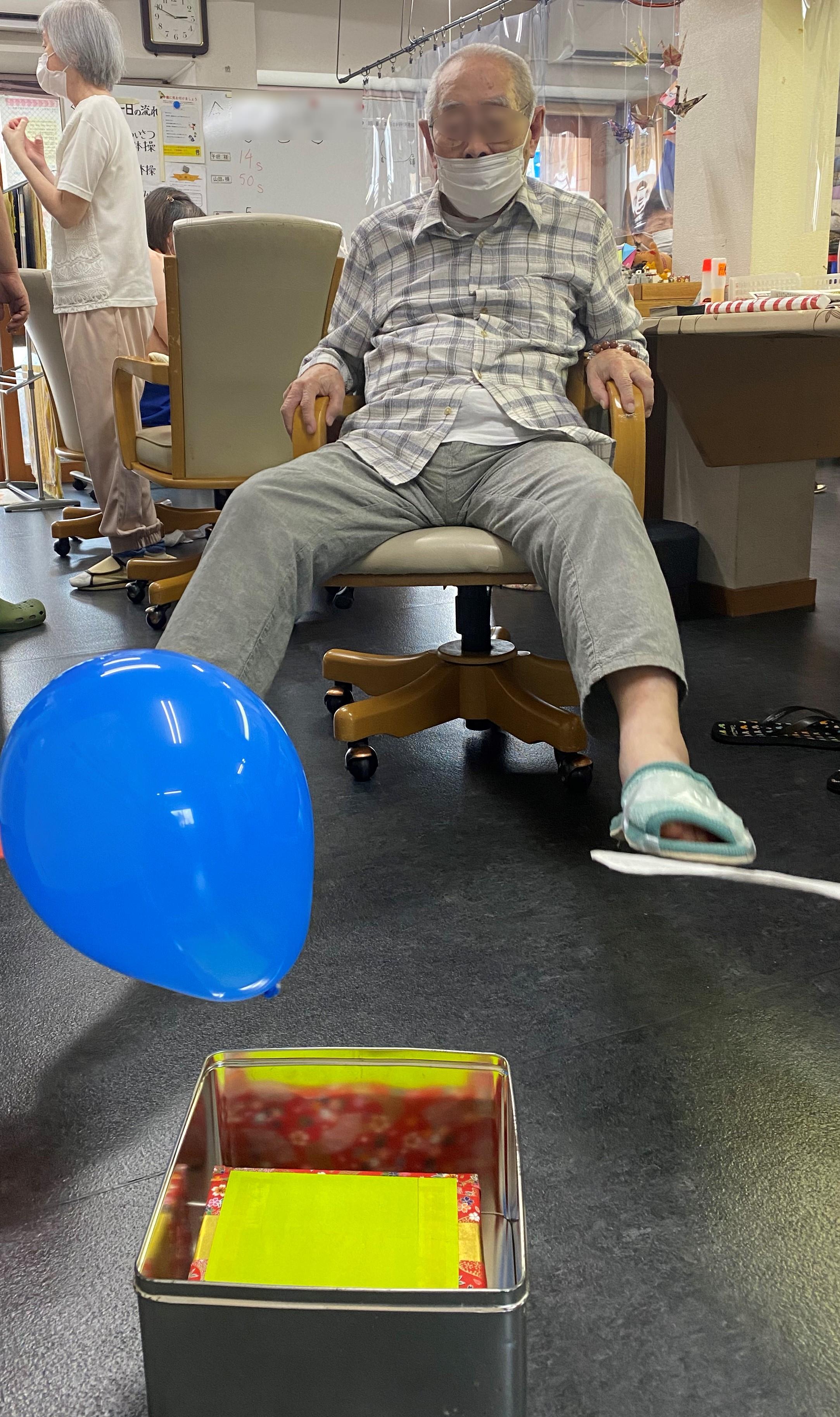 パタパタ風船あおぎです。足に付いたうちわで皆様一生懸命風船をあおいで入れ物から外に出しています。