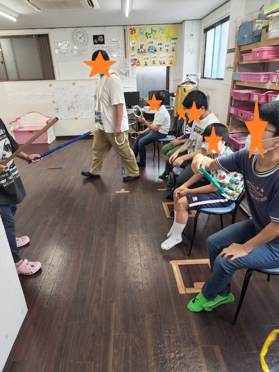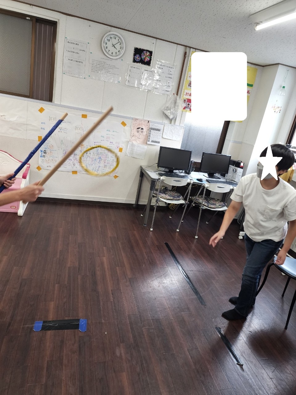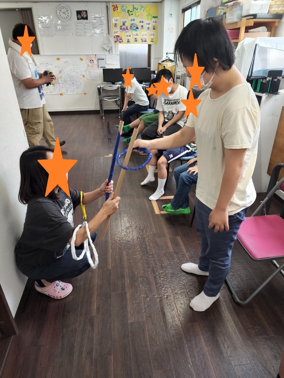 今回はいつもと違って児童が投げる輪っかをスタッフが棒に入れるレクリエーションでした。皆さん色んな方向に輪を投げてみたりと楽しそうにする姿がありました。