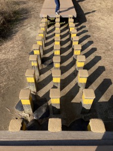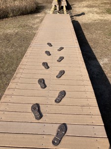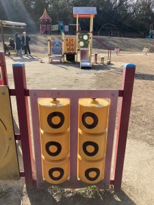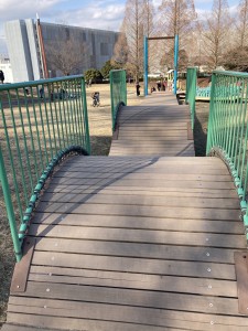 西側のわいわい広場では木のスロープがあり何回か周回しました。登ったり、足跡を踏んだり、杭を渡ったりできます。