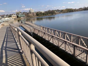 牧野池は広く見るところにより景色が変わります。木の渡り橋になっているところもあります。