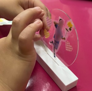 出来上がった写真をアクリルスタンドに貼り、まわりをシールで飾り付け!