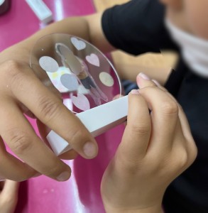 丸いシールを重ねて貼ったり、ハートのシールをたくさん選んだり、みんなそれぞれ可愛く飾り付けができました♫