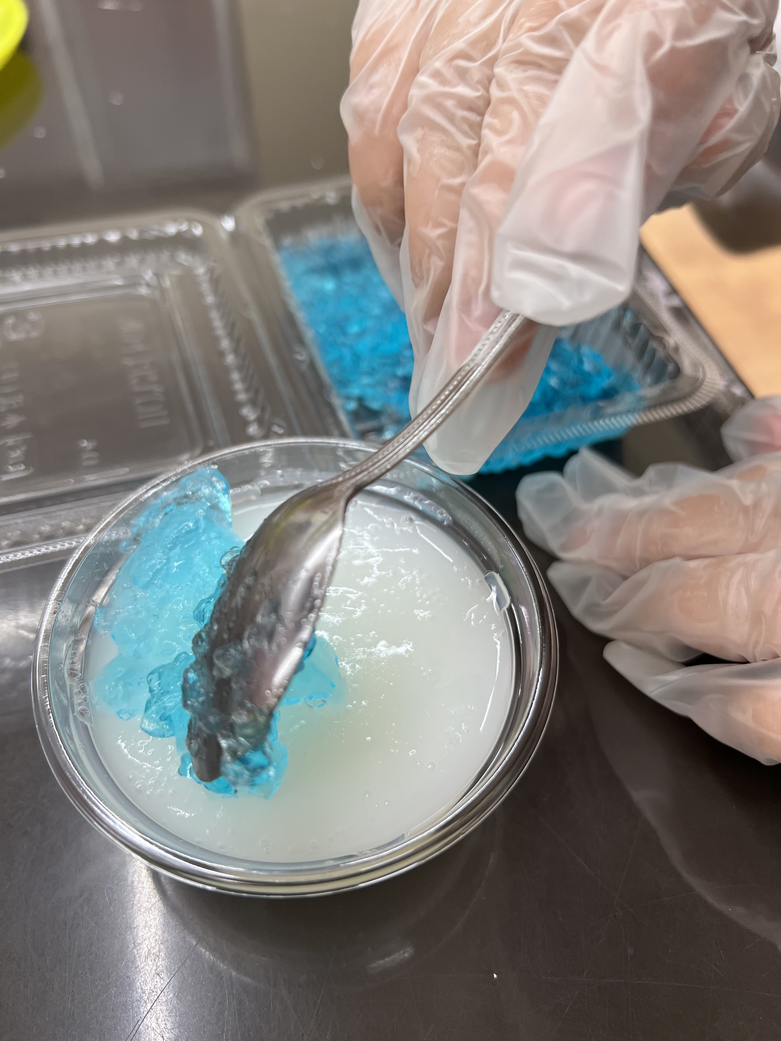 青色のゼリーをフォークで崩して、白いゼリーの上に乗せます。