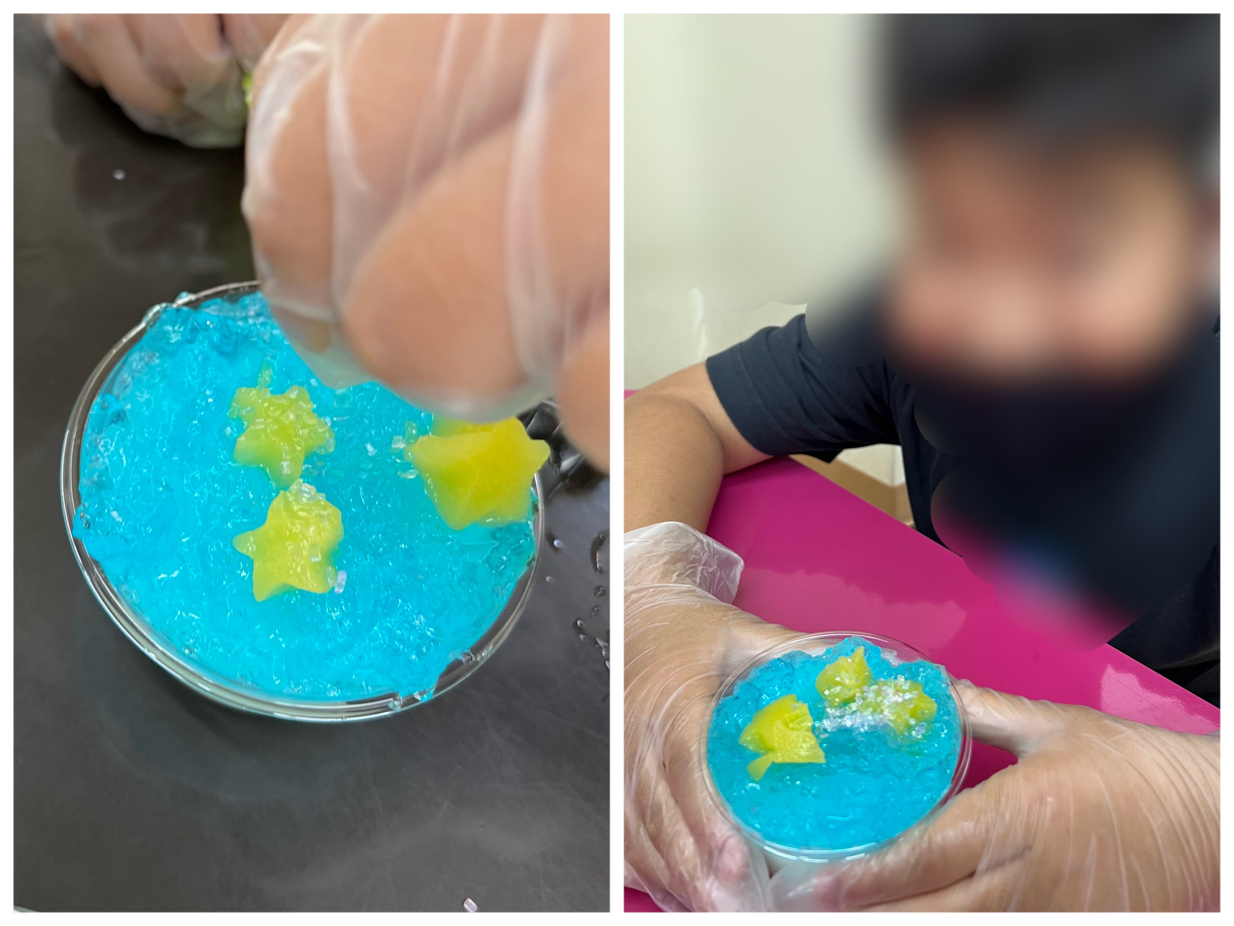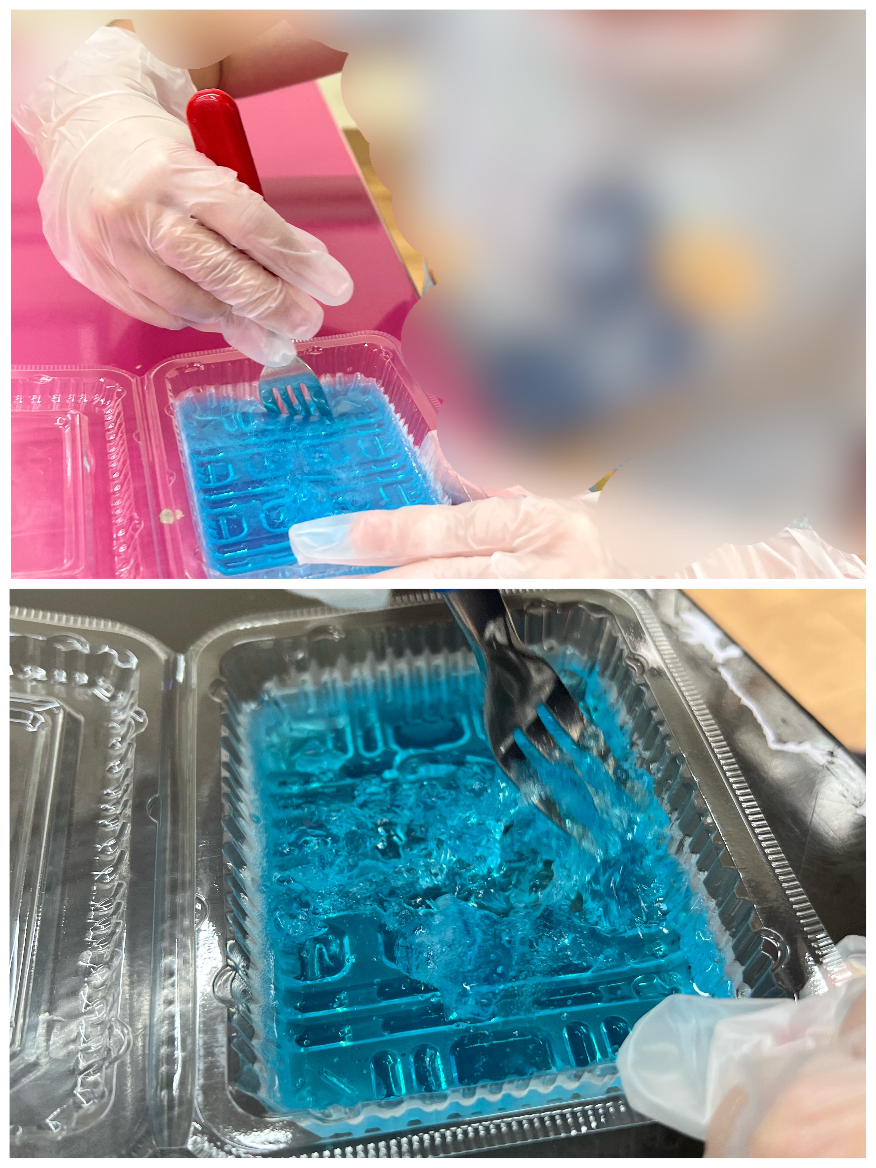 ゼリーが崩れていく様子を楽しんだり、「空みたいだね!」と天の川を想像したり、みんな夢中で混ぜていました♫