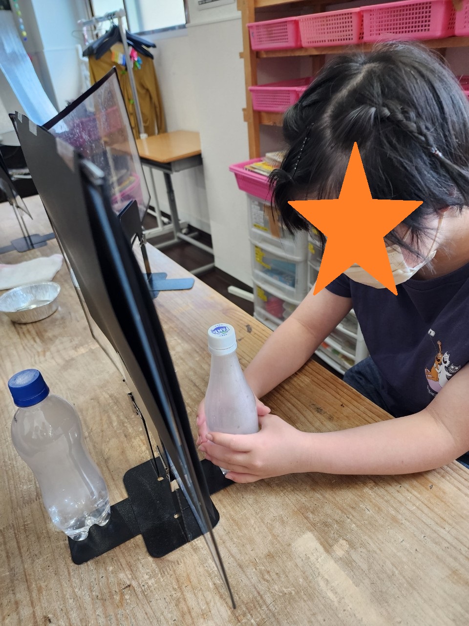 みなさん、不思議そうにペットボトルの中の雲を見つめています。