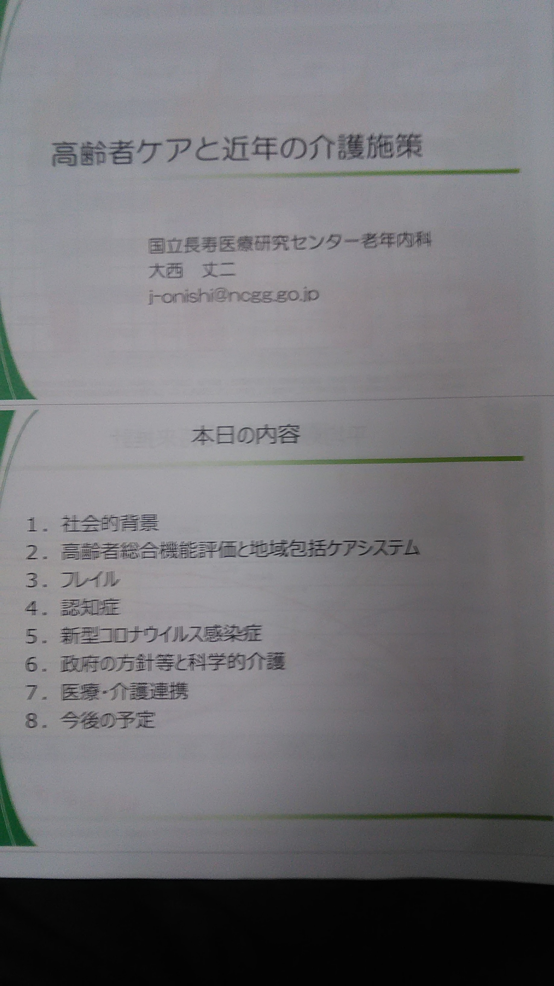 研修は今年6月一杯まで、厚生労働省老健局老人保健課課長補佐で、7月より国立長寿医療研究センター老年内科医師大西氏の今までの介護保険制度の軌跡と今後の介護保険に関してのお話でした。現在LIFEと言われる、デイサービスやショートステイ、入所施設が取り組んでいた高齢者の状態を厚労省が把握して、その変化を今後のサービスに活かすものを、来年には訪問事業所にも加算の設定、情報収集し活用することを行う予定だそうです。ITやIOTを使い、一層の業務効率化を国を挙げて行うようです。