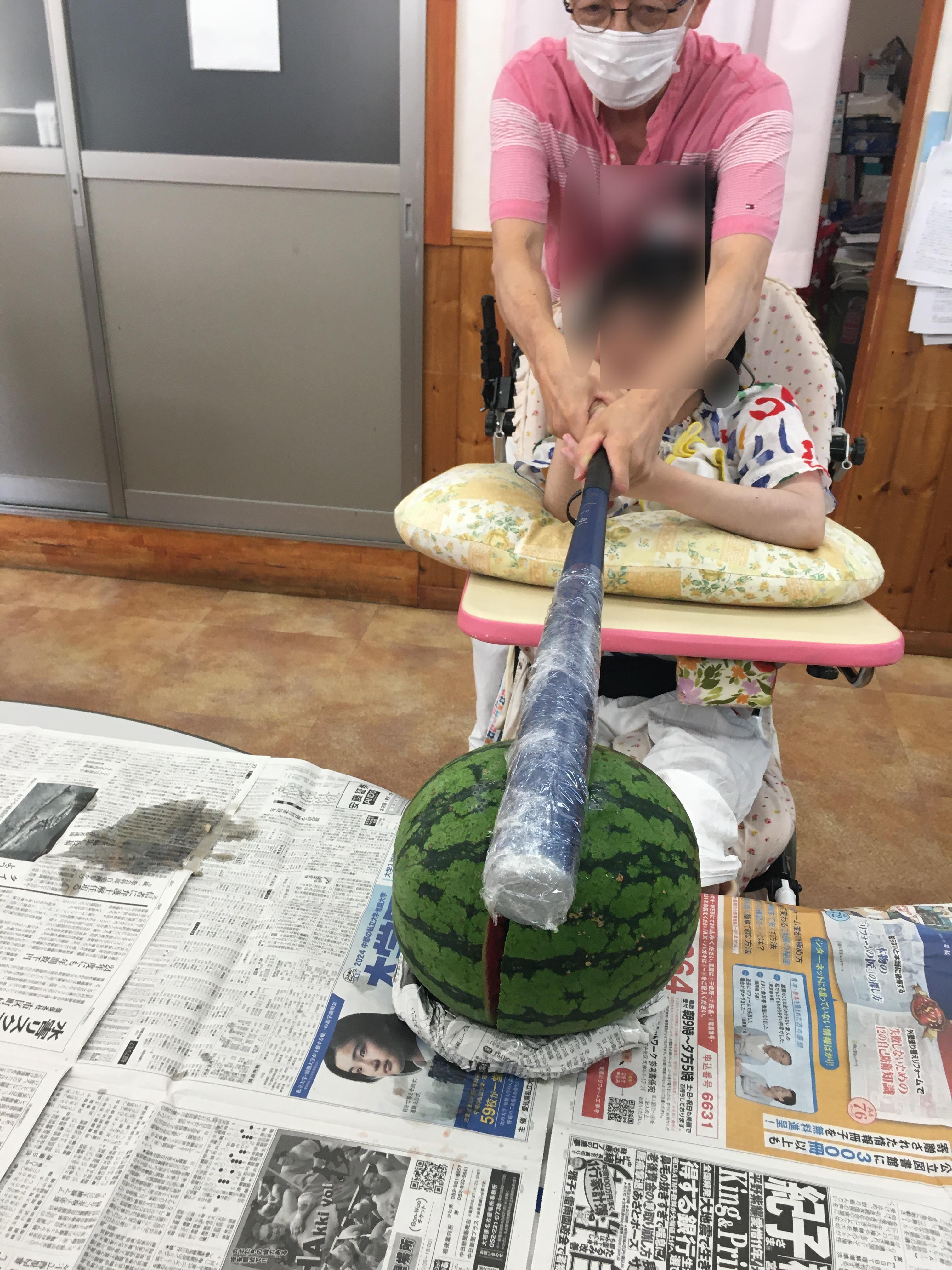 ホーム > あたたかい心 デイサービス > あたころデイ☆スイカ割り🍉 2023/08/03 こんにちは、あたころデイ松本です。 夏休みに入り、お祭りや花火大会等、にぎやかな日々になりましたね🎆 あたころでも、夏といえば~!とスイカ割をしました(^^♪大きく振りかぶって~ ドキドキして思わず目をつぶってしまいました(笑)こちらは、気合十分です‼当たった瞬間ビックリ😲最後に気合を入れて~、えい!見事にひびが入り、「おぉ~」と歓声があがりました😊 スイカジュース🍉にして、みんなで美味しくいただきました♪ - あたたかい心 デイサービス あたころデイ