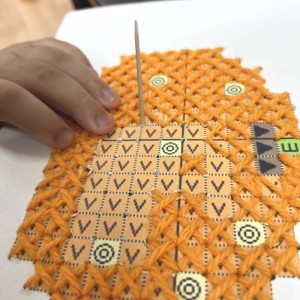 台紙と同じ色に毛糸をさしていく、クロスステッチに取り組んでいます。