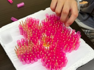 アイロンビーズの容量でつまようじにストローをさしていくストローアート、