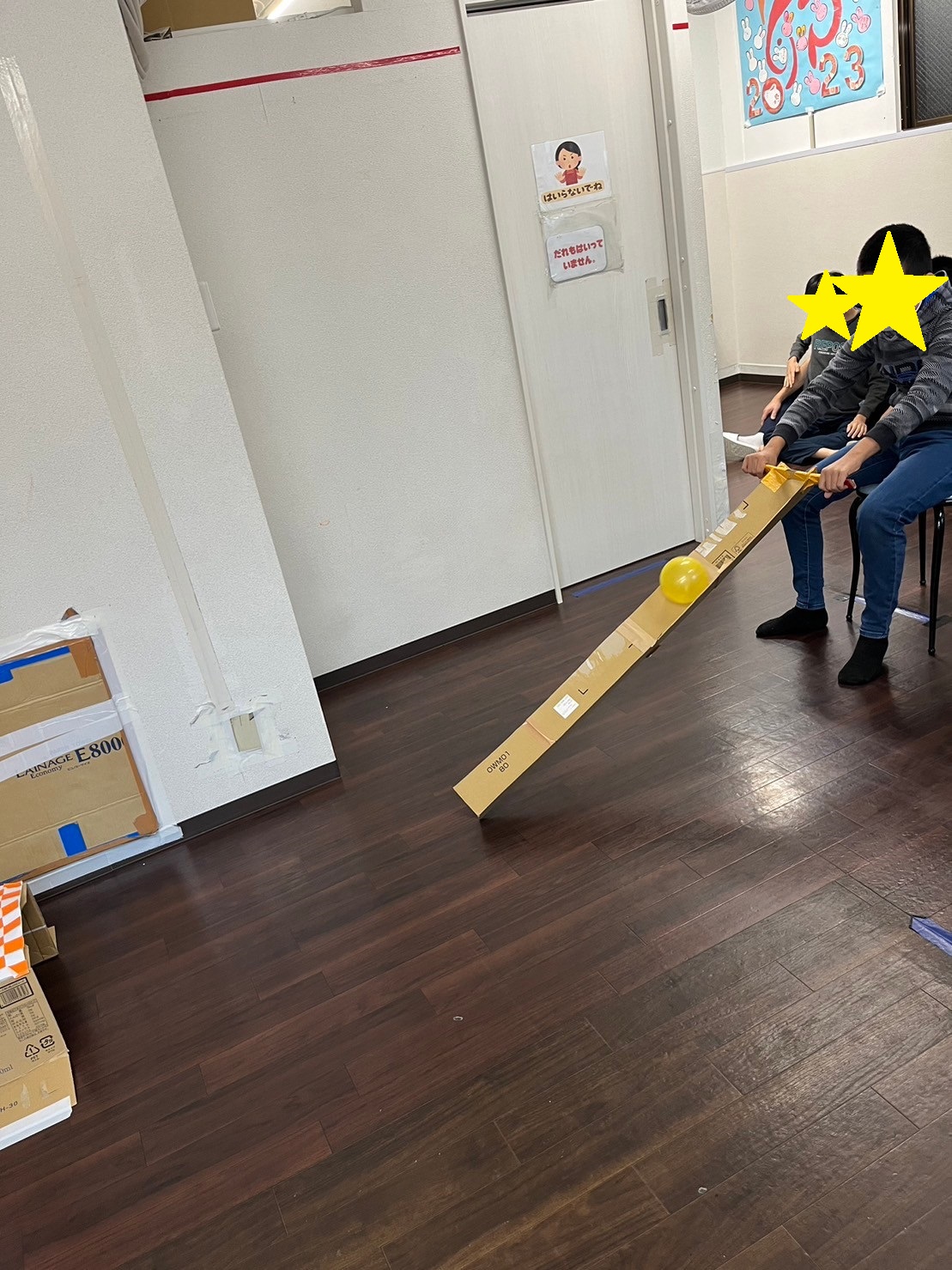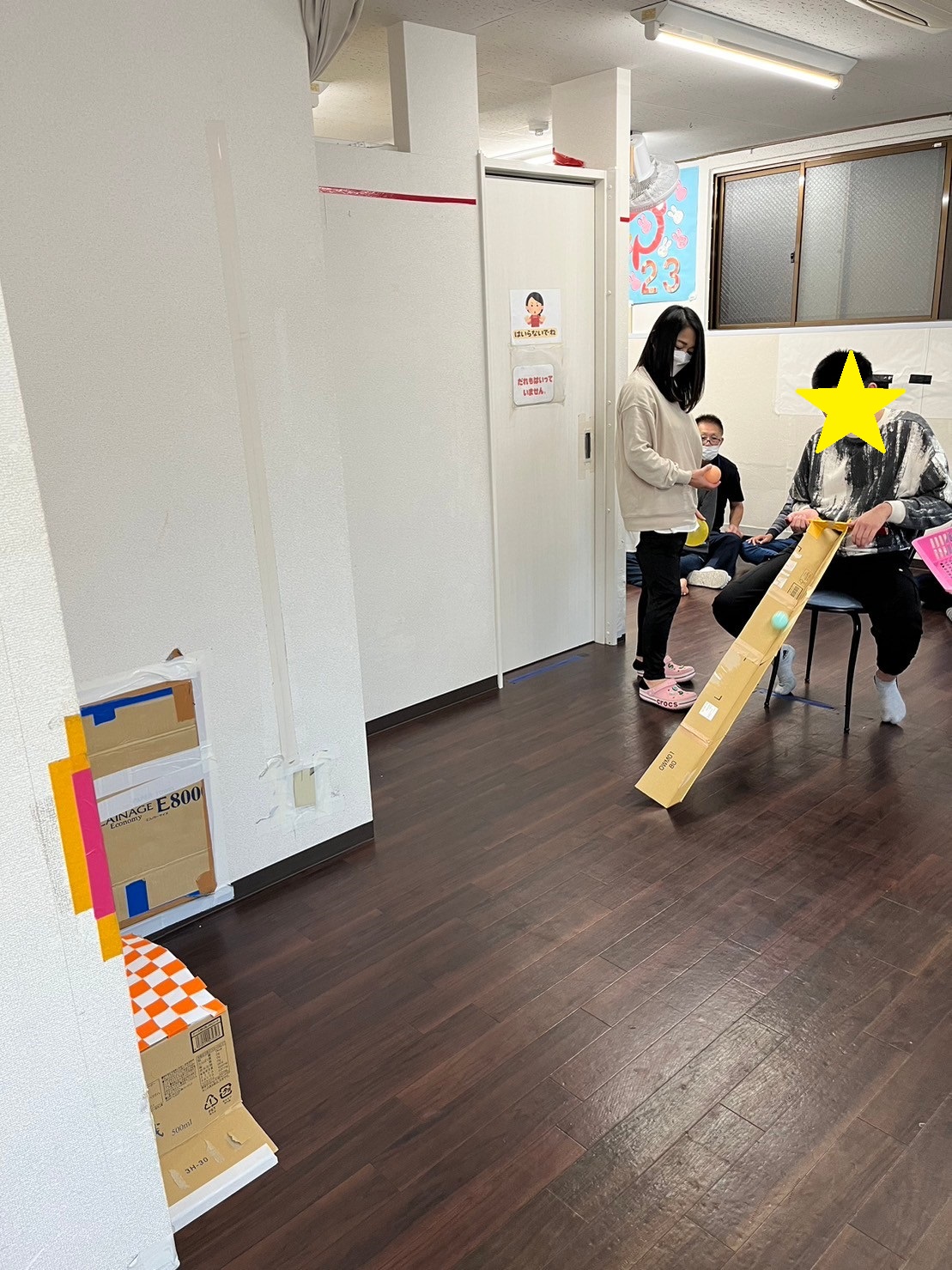 ルールは簡単で椅子に座り段ボールで作ったトイにボールを転がしてゴールに入れる。