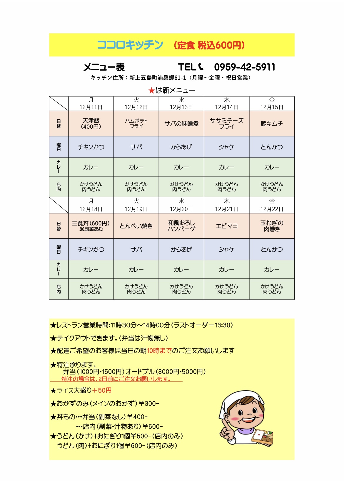 ホーム > 未分類 > 12月11日〜12月22日までのメニュー 2023/12/05 12月11日より店内でお召し上がりの方のみの提供になりますが新メニューでうどん(かけ・肉)が追加となりました! 寒い季節にあたたかいうどんは最高です! ご来店をお待ちいたしております! - 未分類