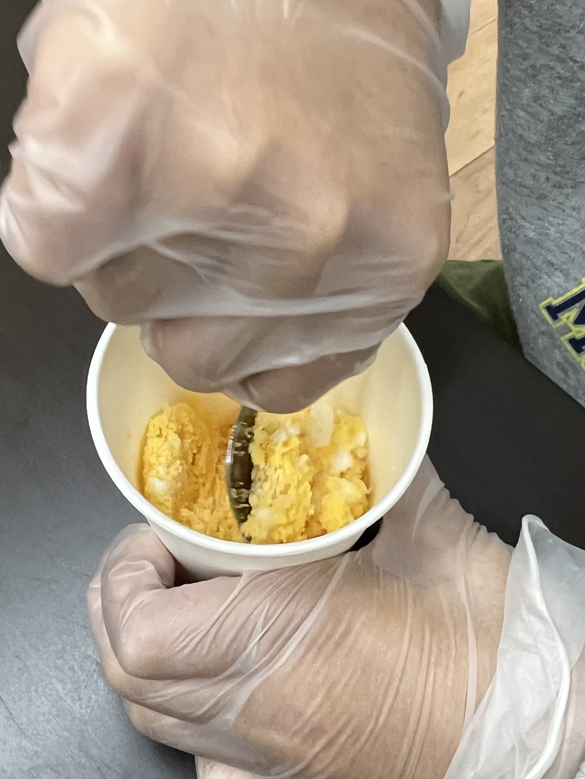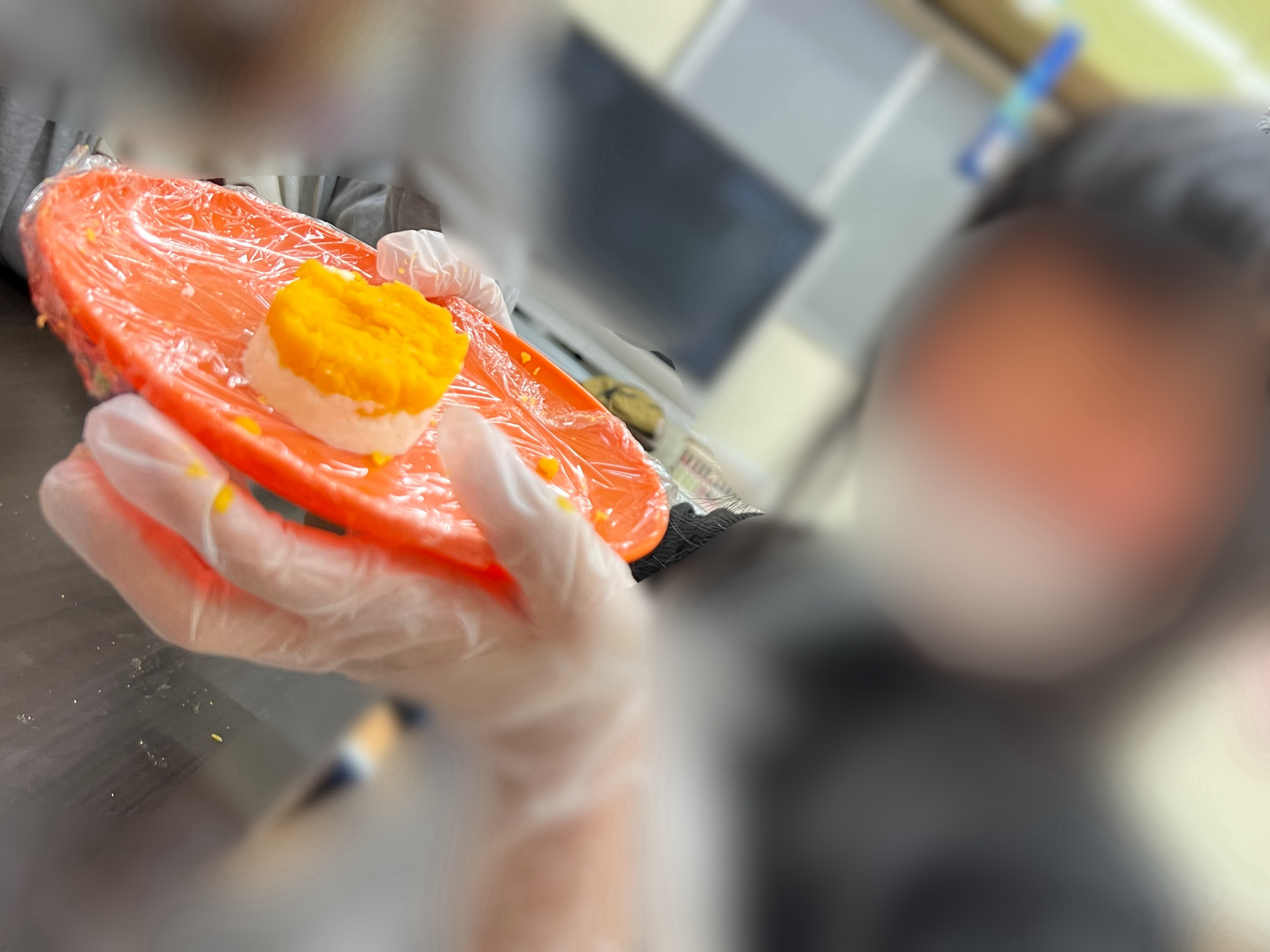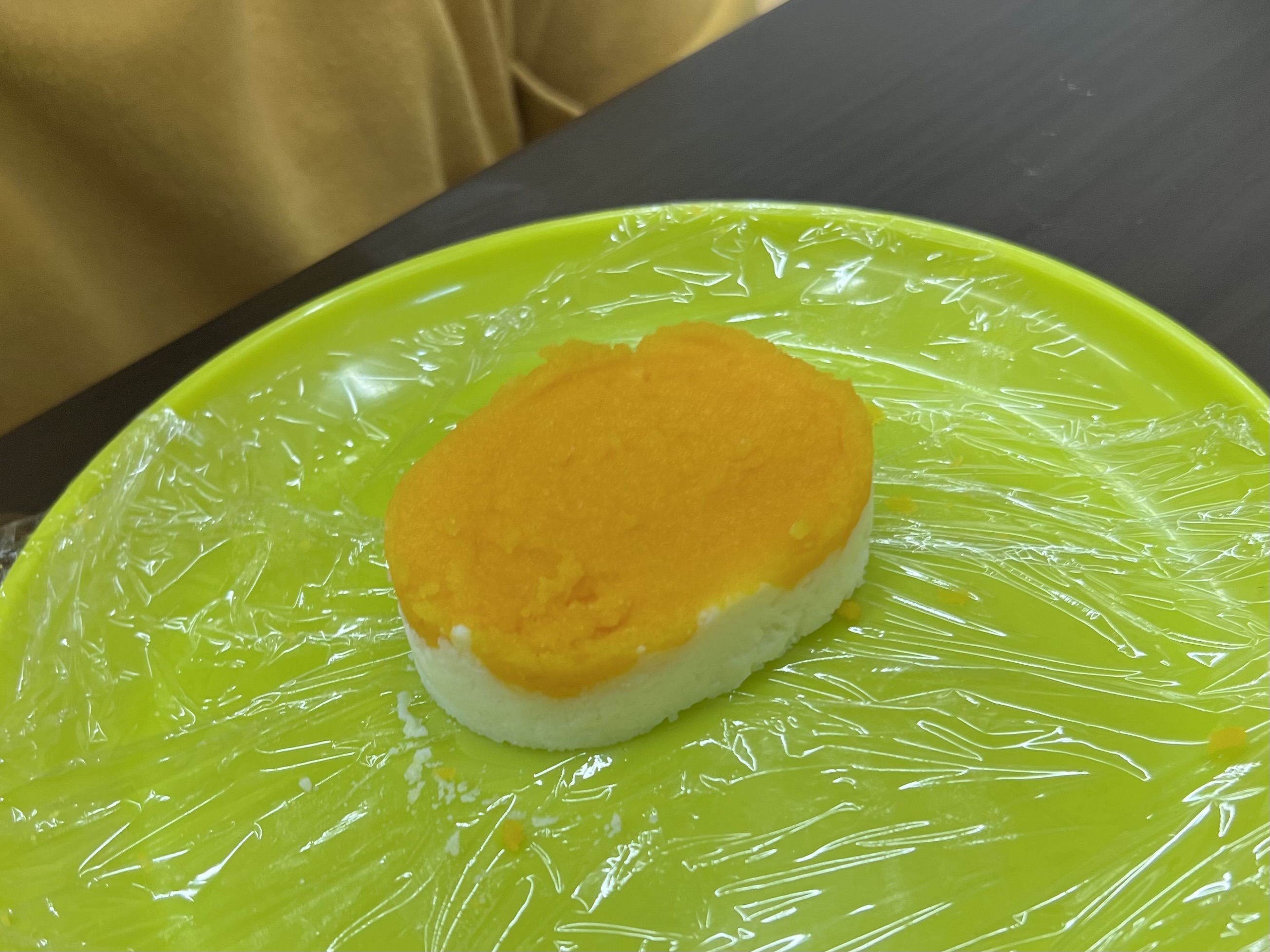 今回、白身にお砂糖を混ぜたものはこちらで用意し、子どもたちには黄身にお砂糖を混ぜ、型に敷き詰める工程を行ってもらいました♪