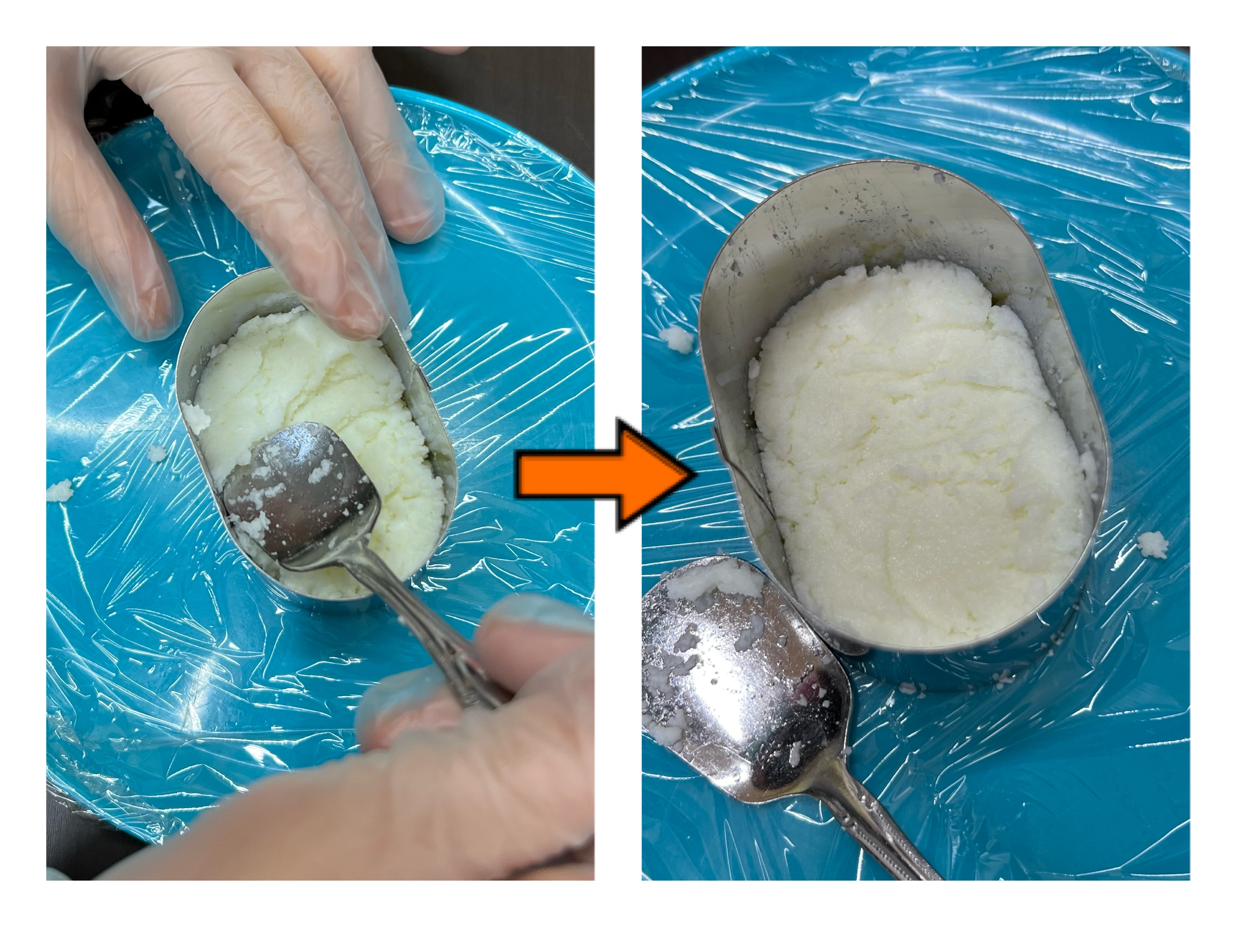 はじめに、白身が潰れないように、優しい力で型に押し入れます。