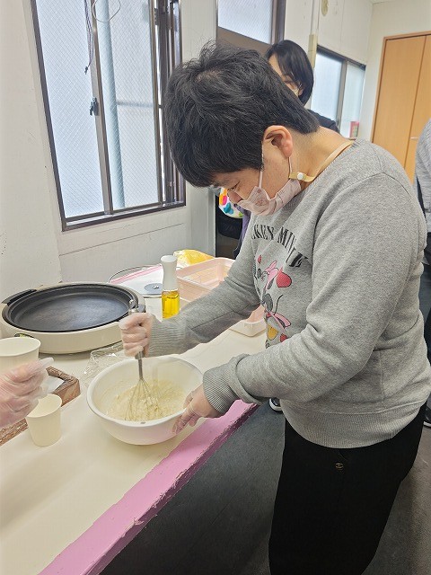 桜餅風のお菓子を皆で作ります。数は利用者さん、職員さん含めておおよそ50個弱!完成しないと当日のおやつはありません! 責任重大です。