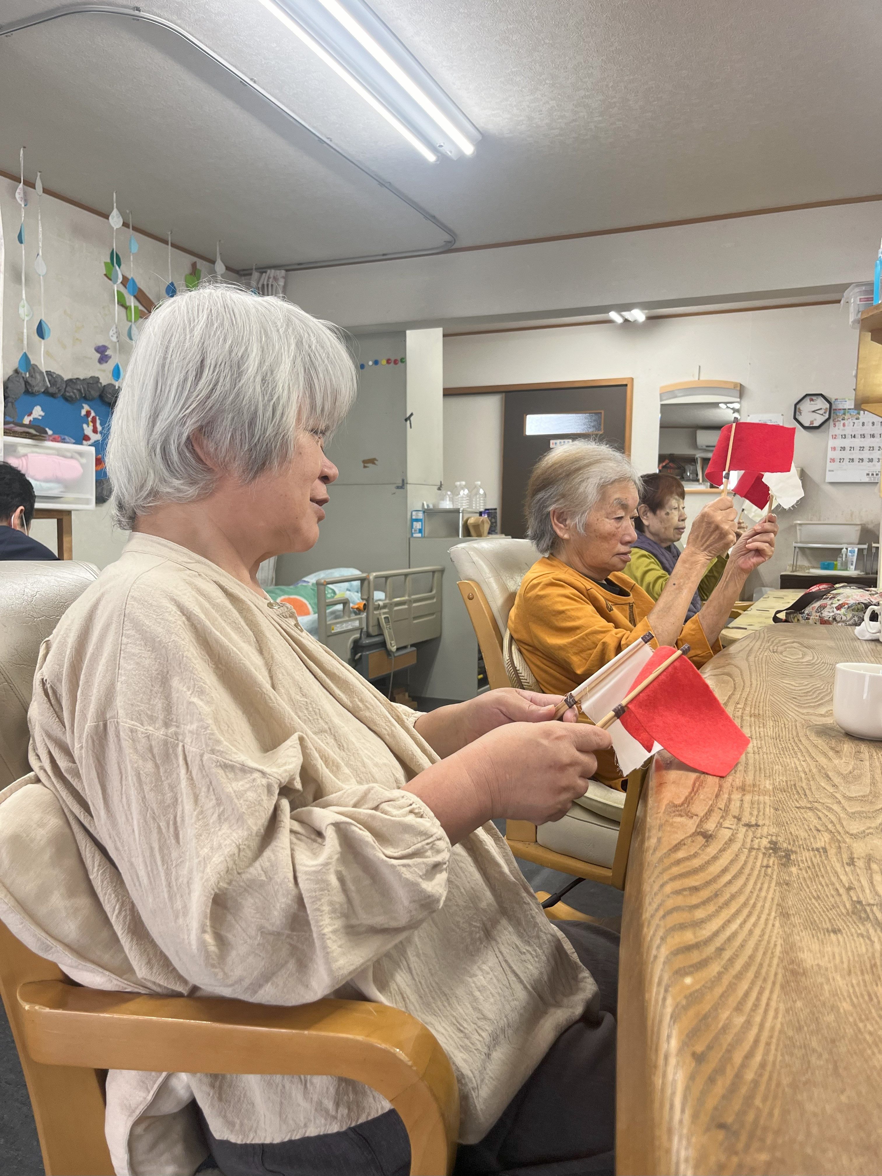旗あげゲーム★「白上げて~!赤あげて~」と指示役をスタッフがやるだけでなく、利用者様にも言ってもらったりしています。これが指示を出す方も結構頭を使います♪