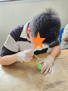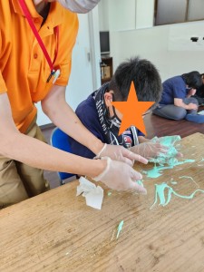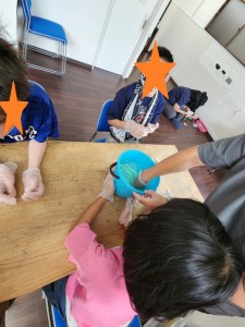 作った後は遊びタイムで皆さん冷たいプルプルのスライムの感触を楽しまれました。