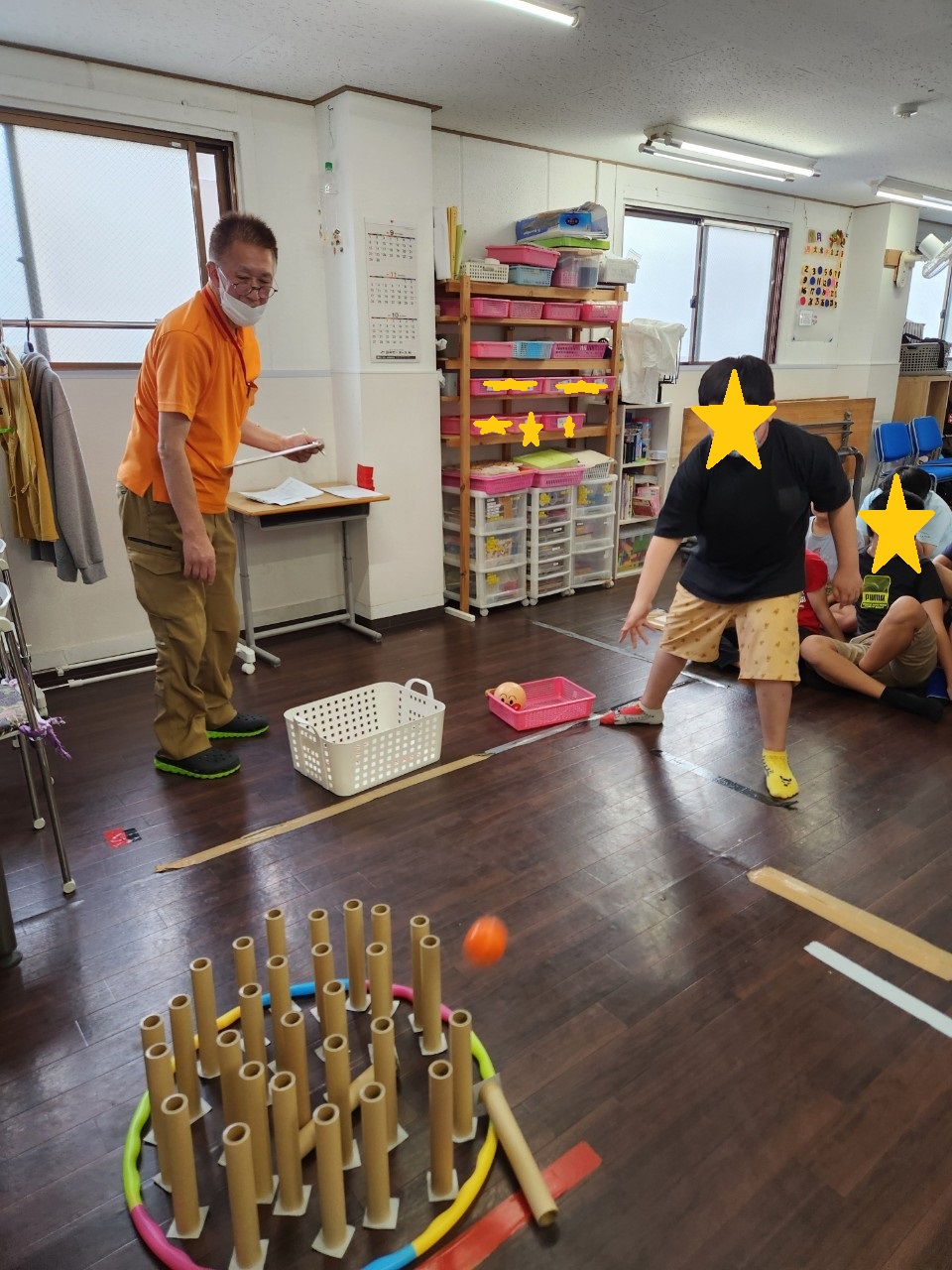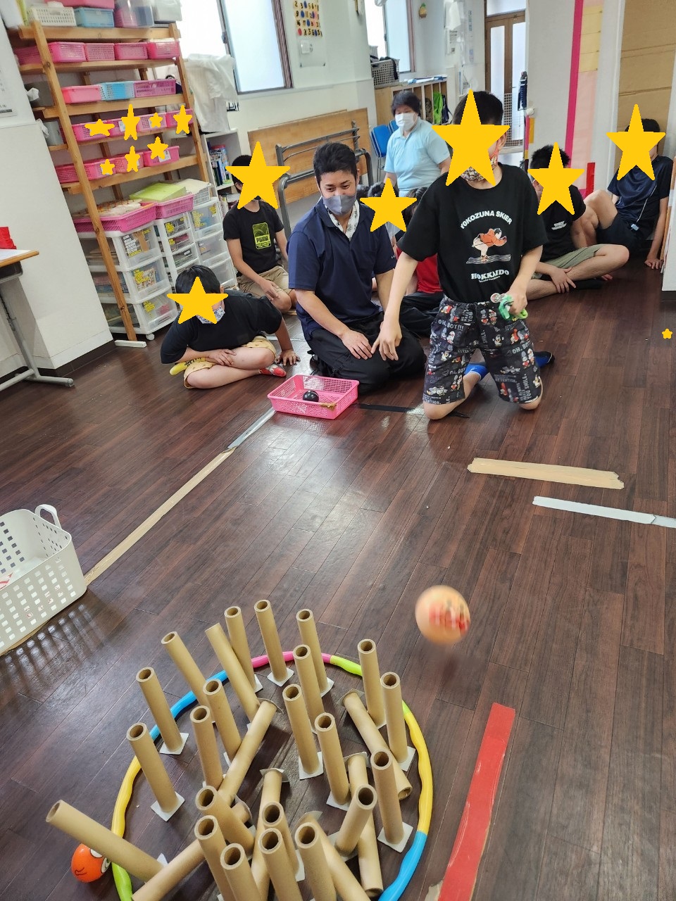 今回は、室内レク「ラップの芯でボーリング」の様子を、ご紹介します。