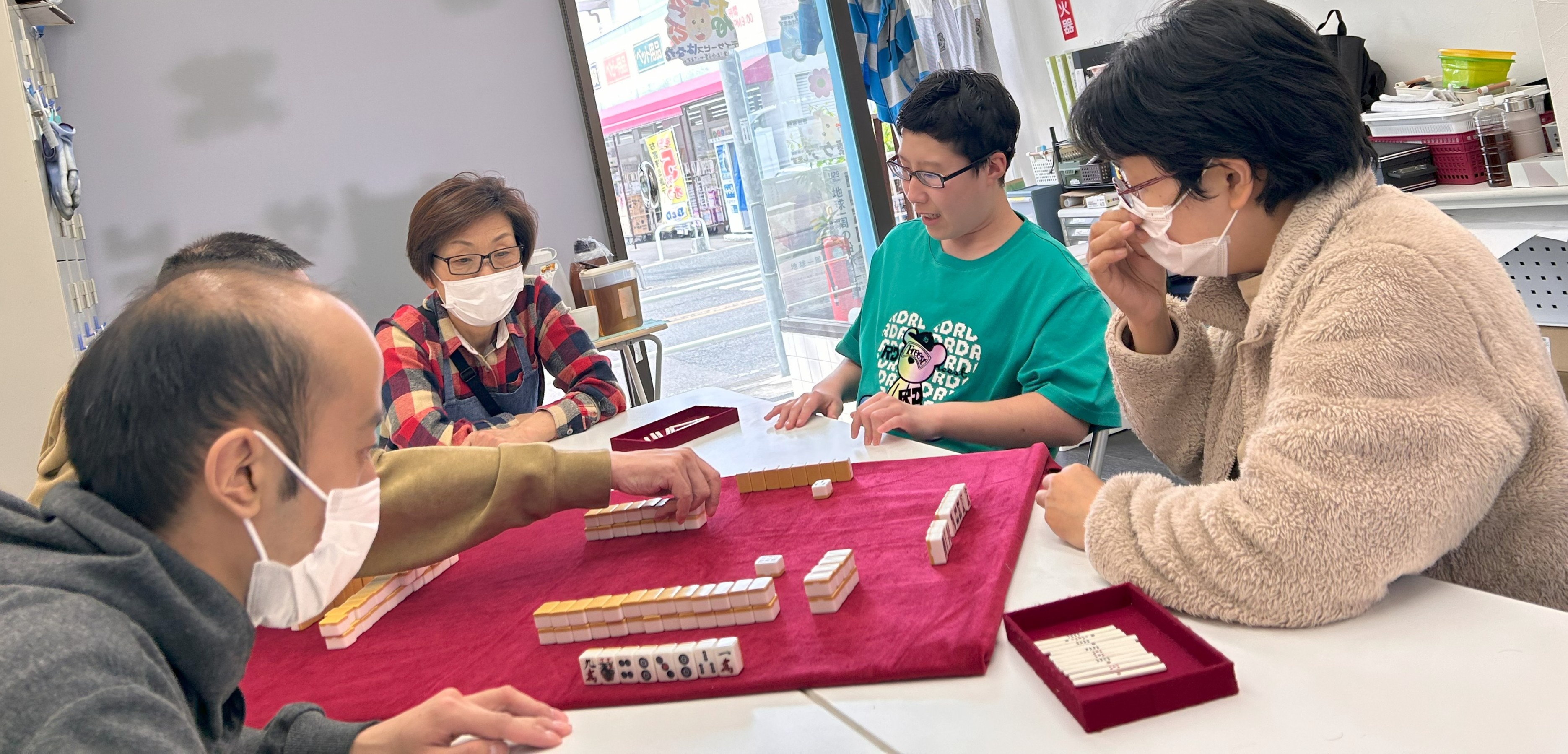 マージャンというと難しく思いがちですが、みんなでできるようにルールを変えて誰もが楽しめるようにしています☆