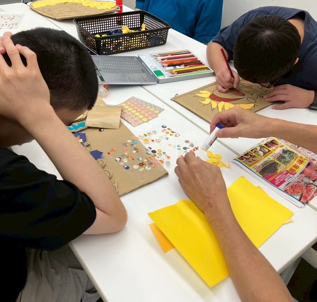 壁や窓に飾り付けができるように、段ボールを型どって職員が切って、みんなで色画用紙をちぎって、貼ったりシールを貼ったりしました☆